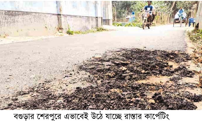 শেরপুর (বগুড়া) সংবাদদাতা : বগুড়ার শেরপুরে নিয়মনীতির তোয়াক্কা না করে নিম্নমানের সামগ্রী ব্যবহার করে রাস্তা পাকাকরণের কাজ শেষ করার ৫ দিন পরেই কার্পেটিং উঠে যাওয়ার অভিযোগ পাওয়া গেছে। এলাকাবাসীর অভিযোগ প্রকৌশলীর সঙ্গে যোগসাজশ করে ঠিকাদার নিম্নমানের কাজ করায় রাস্তার কার্পেটিং উঠে যাচ্ছে। প্রাপ্ত তথ্যে জানা যায়, শেরপুর উপজেলার খামারকান্দি ইউনিয়নের আমতলা ব্রীজ হতে পারভবানীপুর আল হেরা মসজিদ পর্যন্ত ১ কিলোমিটার রাস্তার কার্পেটিংয়ের কাজ গত ৩-৪দিন হলো সমাপ্ত হয়েছে। কাজে ঠিকাদারী প্রতিষ্ঠান নিম্নমানের সামগ্রী ব্যবহার করায় রাস্তার বিভিন্ন জায়গা থেকে কার্পেটিং উঠে গেছে যা নিয়ে এলাকাবাসীর মধ্যে চরম ক্ষোভের সৃষ্টি হয়েছে। সরেজমিনে গেলে এলাকাবাসী আল আমিন