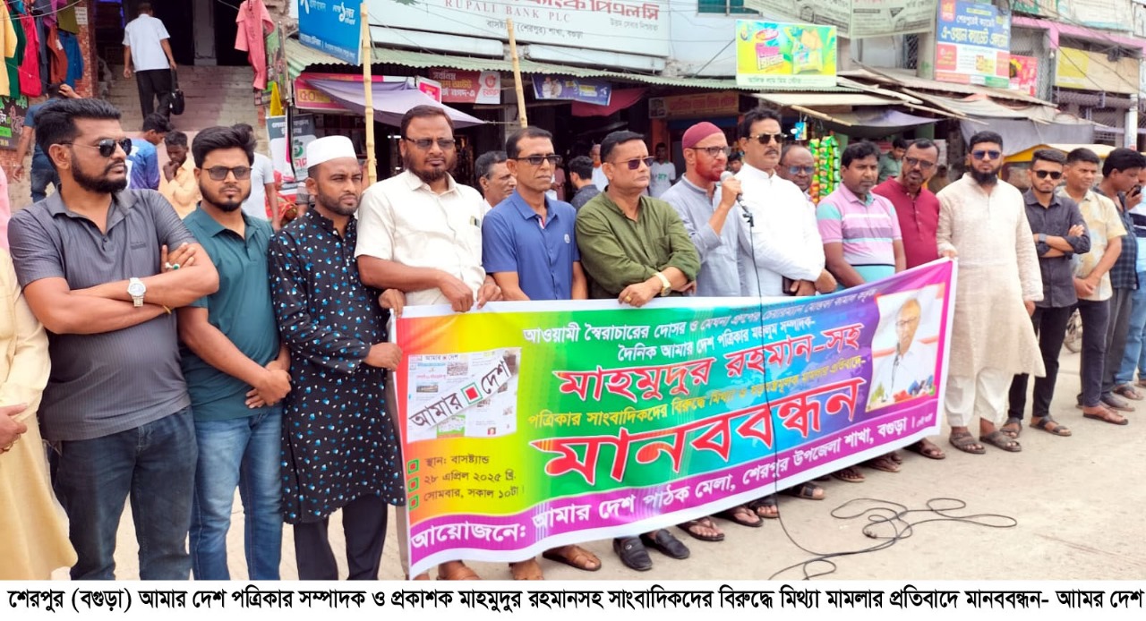 বগুড়ার শেরপুরে দৈনিক আমার দেশ পত্রিকার সম্পাদক ও প্রকাশক মাহমুদুর রহমানসহ পত্রিকার সাংবাদিকদের বিরুদ্ধে মিথ্যা ও ষড়যন্ত্রমূলক মামলার প্রতিবাদে মানববন্ধন অনুষ্ঠিত হয়েছে।