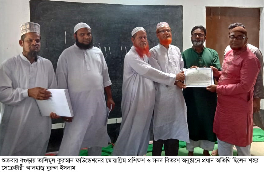 বগুড়া সংবাদ : শুক্রবার সকালে বগুড়া শহরের সেউজগাড়িস্থ তালিমুল কুরআন ফাউন্ডেশন শহর অফিসে তালীমুল কুরআন ফাউন্ডেশন ৪০ দিনব্যাপী মোয়াল্লিম প্রশিক্ষণের সনদ বিতরন ও মুয়াল্লিমদের মান উন্নয়ন ক্লাস অনুষ্ঠান মাওলানা মাছুদুর রহমানের সভাপতিত্বে অনুষ্ঠিত হয়। বাছায়কৃত মুয়াল্লিমদের নিয়ে মানোন্নয়ন ক্লাস পরিচালনা করেন কেন্দ্রীয় প্যানেল ওস্তায ক্বারী মাওলানা আব্দুল্লাহ আল মামুন। সনদ বিতরন অনুষ্ঠানে প্রধান অতিথি ছিলেন তালিমুল কুরআন ফাউন্ডেশনের বগুড়া শহর সেক্রেটারি মাওলানা নুরুল ইসলাম। বিশেষ অতিথি ছিলেন সহ-সভাপতি মোহাম্মদ আব্দুর রউফ, মোঃ নিজাম উদ্দিন, মোঃ নুরে আজম, হাফেজ আব্দুর রশিদ প্রমুখ। অনুষ্ঠানে বক্তরা বলেন দুনিয়াতে শান্তি আখিরাতে মুক্তির জন্য কুরআন সুন্নাহর আলোকে জীবন গড়ার আহবান জানান।