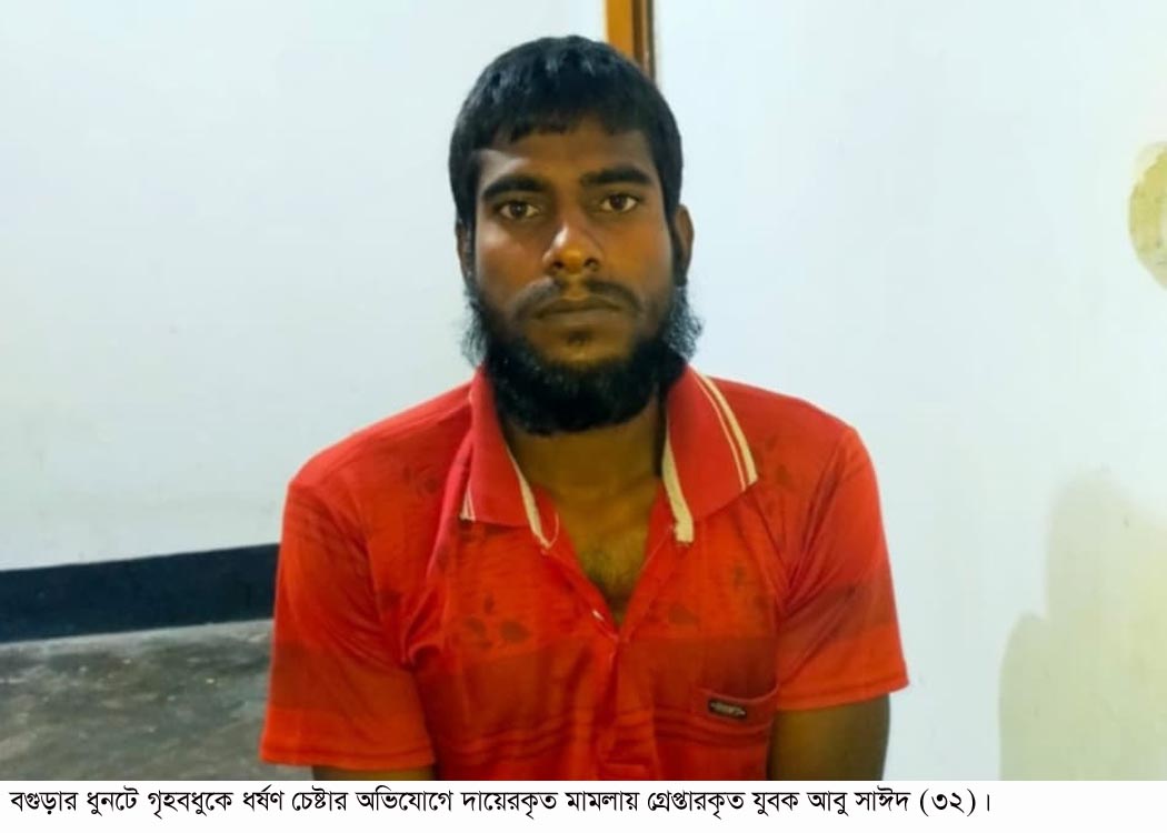 মামলাসূত্রে জানা যায়, গত ২৭ জুন শুক্রবার রাতে ওই গৃহবধূর স্বামী বাড়িতে ছিলেন না। সেই সুযোগে একই গ্রামের বক্সা মন্ডলের ছেলে লম্পট আবু সাঈদ রাত ১টার দিকে ঘরের দরজার রশি কেটে গৃহবধুর ঘরে প্রবেশ করে। এরপর ঘুমন্ত অবস্থায় গৃহবধুর স্পর্শকাতর স্থানে হাত দিয়ে পড়নের কাপড় খুলে ধর্ষণের চেষ্টা করে। এসময় গৃহবধু ঘুম থেকে জেগে চিৎকার দিলে আবু সাঈদ পালিয়ে যান। এ ঘটনায় ওই গৃহবধু বাদী হয়ে সোমবার (৭ জুলাই) আবু সাঈদের বিরুদ্ধে ধুনট থানায় নারী ও শিশু নির্যাতন দমন আইনে একটি মামলা দায়ের করেন। ওই মামলায় সোমবার বিকেলে চিকাশি ইউনিয়নের জোড়শিমুল বাজার এলাকা থেকে তাকে গ্রেপ্তার করে পুলিশ।