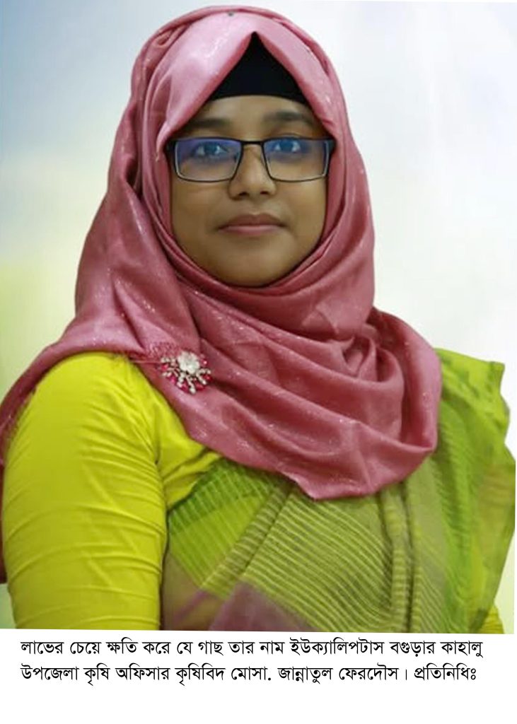 বগুড়া সংবাদ :বগুড়ার কাহালু উপজেলা কৃষি অফিসার কৃষিবিদ মোসা. জান্নাতুল ফেরদৌস বলেন, কৃষিজমির পাশে ইউক্যালিপটাস লাগানো মারাতœক হুমকি। এ গাছের শিকড় অনেক গভীর গিয়ে প্রচুর পরিমাণে পানি শোষণ করে। ফলে জমিতে পানি স্বপ্লতার জন্য ফলন ভালো হয় না। সাধারণ গাছ প্রকৃতি ও পরিবেশের ভারসাম্য রক্ষার পাশাপাশি প্রাণিকুলের স্বাভাবিক শ্বাস-প্রশ্বাস নাইট্রোজেন গ্রহণ করে আর অক্রিজেন সরবরাহ করে সহায়তা করে। কিন্তু ইউক্যালিপটাস তা করে না। বরং এ গাছ অক্রিজেন গ্রহণ, কার্বন ডাই অক্রাইড ত্যাগ এবং নাইট্রোজেন নির্গমন করে। আবাদি জমির আইলে এ গাছ থাকলে থেতে পোকামাকড় ও রোগবালাই বেড়ে যায়। ইউক্যালিপটাস গাছ জমির উরর্বতা শক্তি কমিয়ে দেওয়া সহ কৃষিক্ষেত্রে ব্যাপক ক্ষতিসাধন করে। কৃষি বিভাগ মাঠ পযায়ে এ গাছ না লাগাতে এবং এর ক্ষতিকর দিকগুলো তুলে ধরে কৃষকদের নিরৎসাহিত করা হচ্ছে। এসব গাছ মানুষ কেন লাগাচ্ছে, তা খুঁজে বের করে ওই লোকগুলোকে নিরৎসাহিত করতে হবে। আমরা পরিবেশের জন্য ক্ষতিকর ইটভাটা উচ্ছেদ করতে পারি, নানা অবৈধ স্থাপনা উচ্ছেদ করতে পারি। তাহলে পরিবেশের জন্য ক্ষতিকর গাছগুলোর ব্যাপরে কেন যতœশীল অচরণ পাই না? সরকারের নির্দেশনা বাস্তবায়িত হলে এই গাছ রোপনের প্রবণতা কমে যাবে। পরিবেশ উপযোগী না হওয়ায় বন ও পরিবেশ মন্ত্রণালয় ২০০৮ সালে এক প্রজ্ঞাপনে দেশে ইউক্যালিপটাসের চারা উৎপাদন নিষিদ্ধ করে। তারপর থেকেই আমরা ইউক্যালিপটাস গাছের চারা উৎপাদন করি না এবং নার্সারির মালিকদের গাছের চারা উৎপাদনে নিষেধ করে আসছি।