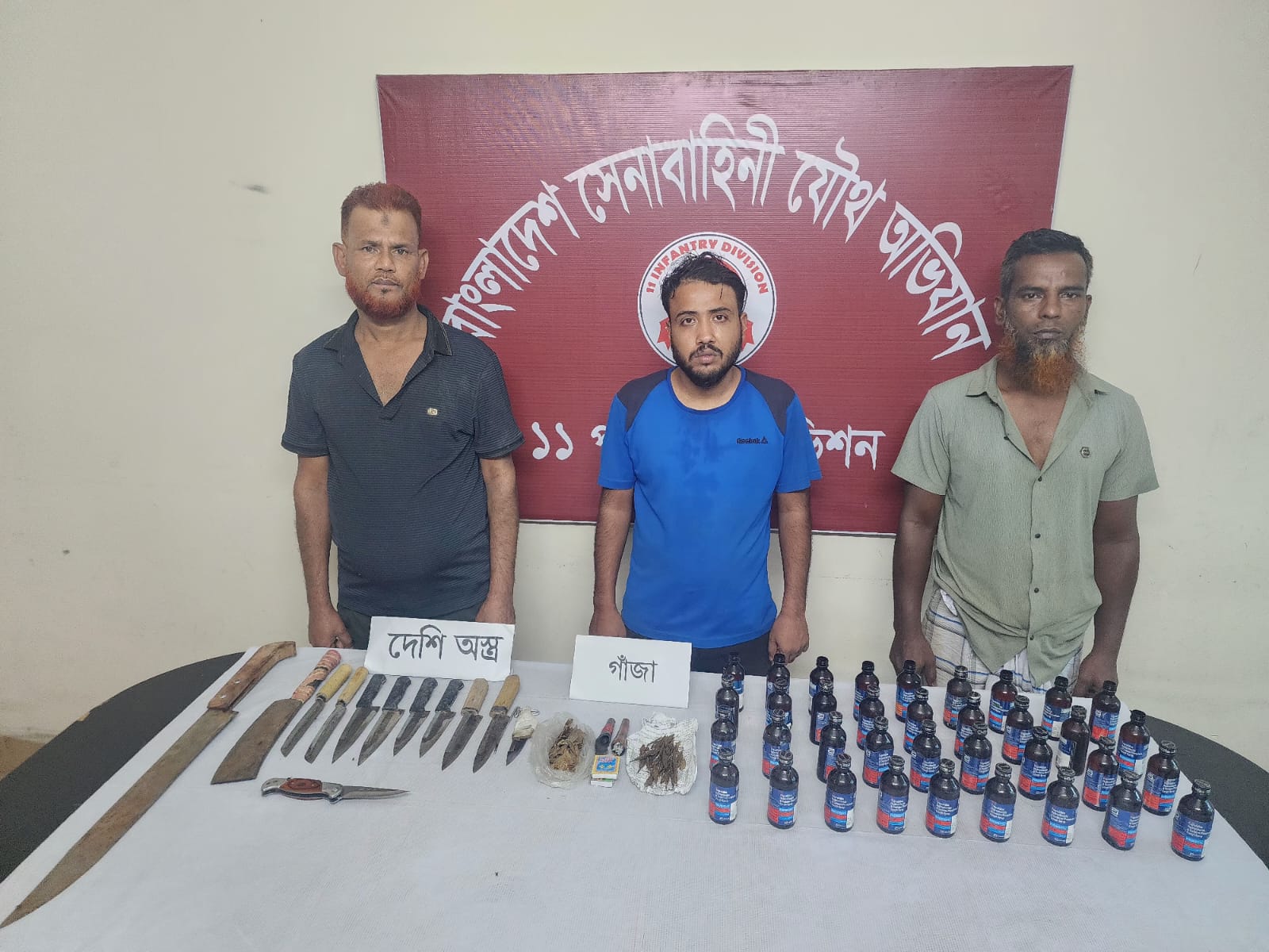 গ্রেফতারকৃতরা হলো শহরের চক সুত্রাপুর এলাকার আব্দুল মোতালেবের ছেলে ফেরদৌস (৪৫), সেউজগাড়ি পালপাড়ার মৃতঃ সালাউদ্দিনের ছেলে আলম আকন্দ (৪৫), আলম আকন্দের স্ত্রী তাসলিমা বেগম (৩৭), মেয়ে আইরিন আক্তার সোনালী এবং চকসুত্রাপুরের সিরাজ শেখ এর ছেলে শাওন শেখ (২৭)। এসময় তাদের নিকট থেকে ১১টি দেশীয় অস্ত্র, ১টি বার্মিজ চাকু, ১৫ বোতল ফেন্সিডিল, ২০০ গ্রাম গাঁজা ও গাঁজা সেবনের সরঞ্জাম এবং বিপুল পরিমাণ খালি ফেন্সিডিলের বোতল উদ্ধার করা হয়।