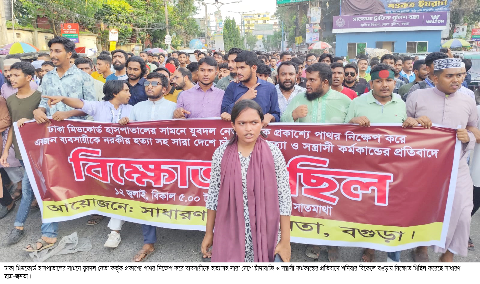বগুড়া সংবাদ : ঢাকা মিডফোর্ড হাসপাতালের সামনে যুবদল নেতা কর্তৃক প্রকাশ্যে পাথর নিক্ষেপ করে ব্যবসায়ীকে হত্যাসহ সারা দেশে চাঁদাবাজি ও সন্ত্রাসী কর্মকান্ডের প্রতিবাদে বগুড়ায় বিক্ষোভ মিছিল করা হয়েছে। শনিবার (১২ জুলাই) বিকেলে বগুড়ার সাধারণ ছাত্র-জনতার ব্যানারে এই মিছিল করা হয়।