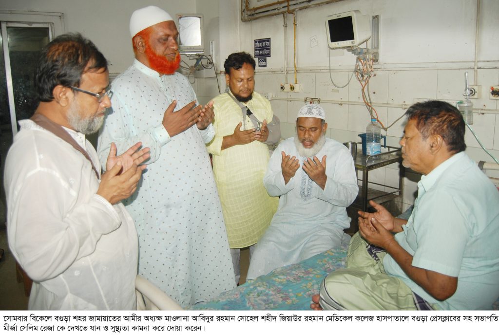 বগুড়া সংবাদ: বগুড়া শহর জামায়াতের আমীর অধ্যক্ষ মাওলানা আবিদুর রহমান সোহেল সোমবার বিকেলে শহীদ জিয়াউর রহমান মেডিকেল কলেজ হাসপাতালে বগুড়া প্রেসক্লাবের সহ সভাপতি মীর্জা সেলিম রেজা কে দেখতে যান ও চিকিৎসার খোঁজ খবর নেন। এ সময় উপস্থিত ছিলেন শহর জামায়াতের সেক্রেটারী অধ্যাপক আ স ম আব্দুল মালেক, সহকারী সেক্রেটারী অধ্যাপক রফিকুল আলম, প্রচার সম্পাদক অধ্যক্ষ ইকবাল হোসেন। পরে তিনি দ্রুত সুস্থ্যতার জন্য মহান আল্লাহর রহমত কামনা করে দোয়া করেন।