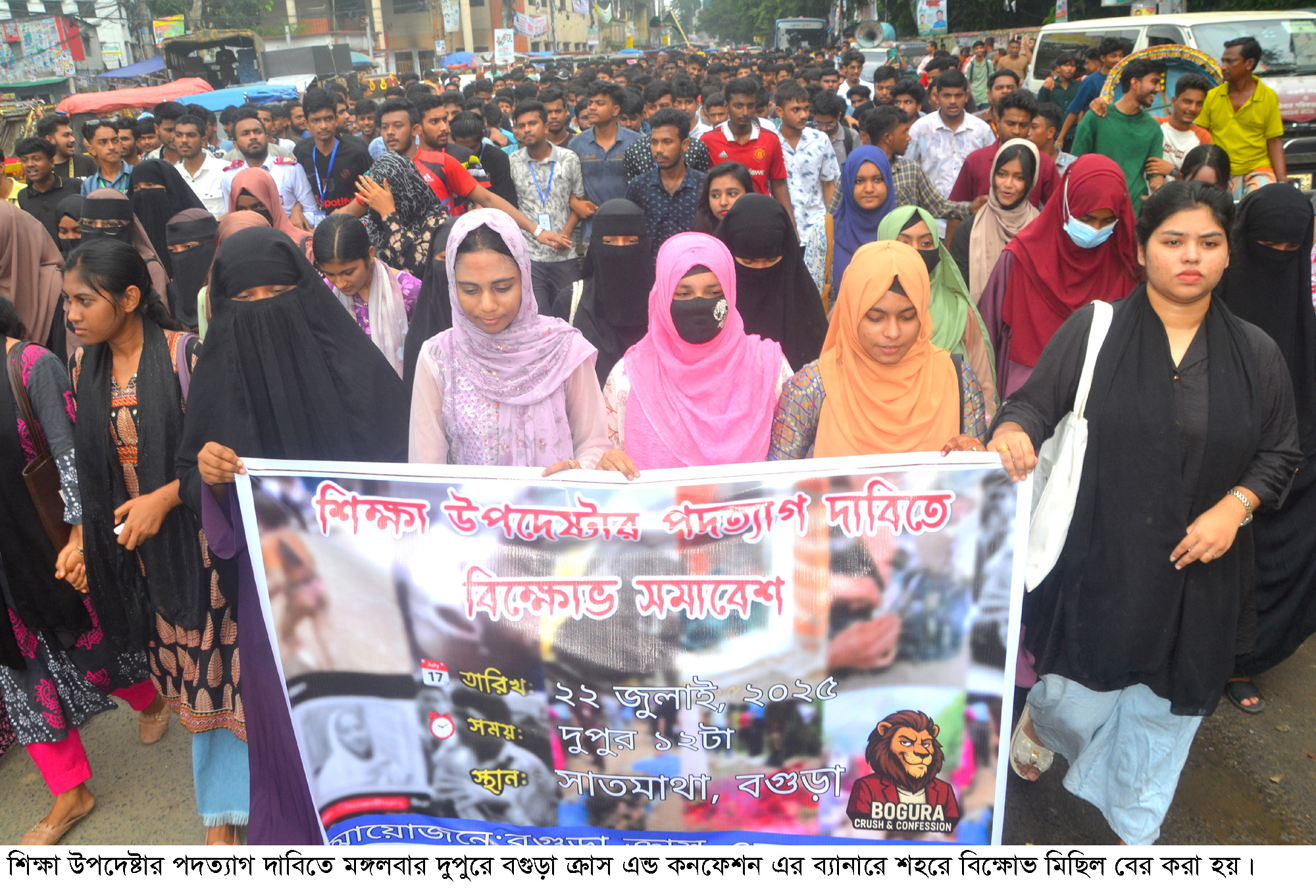 বগুড়া সংবাদ : শিক্ষা উপদেষ্টা অধ্যাপক ড. সি. আর. আবরার এর পদত্যাগসহ ছয় দফা দাবিতে বগুড়ায় বিক্ষোভ সমাবেশ করা হয়েছে। মঙ্গলবার (২২ জুলাই) দুপুরে বগুড়া ক্রাস এন্ড কনফেশন এর ব্যানারে শিক্ষার্থীরা শহরের সাতমাথায় বিক্ষোভ শেষে জেলা প্রশাসকের কার্যালয়ের সামনে বসে পড়েন।
