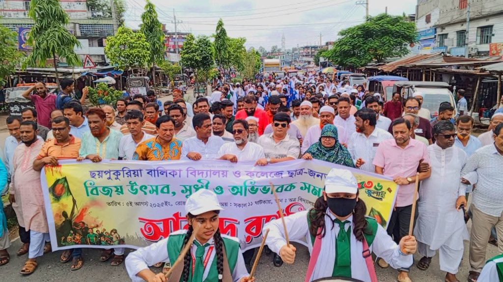 বগুড়া সংবাদ : বগুড়ার ঐতিহ্যবাহী শিক্ষা প্রতিষ্ঠান ছয়পুরকুরিয়া বালিকা বিদ্যালয় ও কলেজে আজ (৫ আগস্ট ২০২৫, মঙ্গলবার) অনুষ্ঠিত হয়েছে এক বর্ণাঢ্য বিজয় উৎসব, সুধী ও অভিভাবক সমাবেশ। সকাল ১১টায় বিদ্যালয় প্রাঙ্গণে আয়োজিত এ অনুষ্ঠানে শিক্ষার্থী, শিক্ষক, অভিভাবক ও স্থানীয় গণ্যমান্য ব্যক্তিবর্গের উপস্থিতিতে পুরো ক্যাম্পাস উৎসবমুখর হয়ে ওঠে।