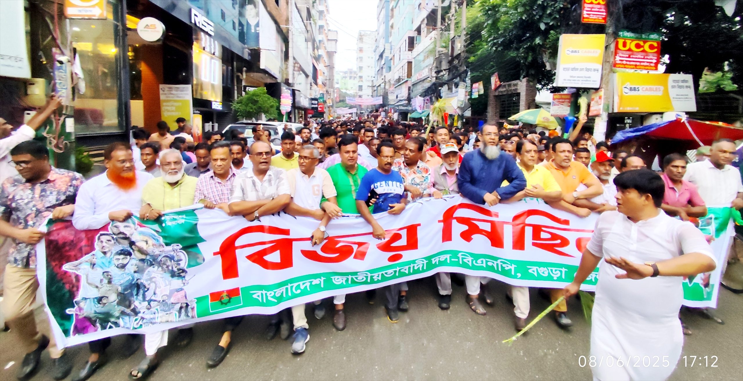 বগুড়া সংবাদ : জুলাই গণঅভ্যূত্থানের বর্ষপূর্তি উপলক্ষে বগুড়ায় বিএনপির বিজয় মিছিলে হাজার হাজার নেতাকর্মীর ঢল। কেন্দ্রীয় কর্মসূচির অংশ হিসেবে বুধবার (৬ আগস্ট) বগুড়া জেলা বিএনপির উদ্যোগে শহরের আলতাফুন্নেছা খেলার মাঠ থেকে মিছিলটি বের হয়। মিছিলটি শহরের গুরুত্বপূর্ণ সড়ক প্রদক্ষিণ করে নবাববাড়ী সড়ক দলীয় কার্যালয়ে এসে শেষ হয়। এতে অংশ নেয় বিএনপিসহ অঙ্গসহযোগী সংগঠনের হাজার হাজার নেতাকর্মী। এসময় শহরের বিভিন্ন সড়কে যান চলাচল বন্ধ হয়ে যায়। নেতাকর্মীদের উপস্থিতিতে কানায় কানায় ভরে যায় পুরো শহর।
