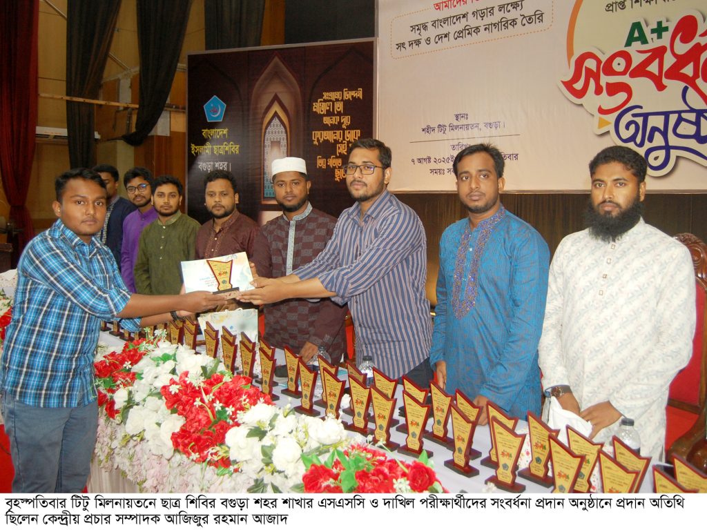 বগুড়া সংবাদ : বগুড়ায় এসএসসি দাখিল পরীক্ষায় জিপিএ ৫ পাওয়া ৫ শতাধিক শিক্ষার্থীদের সংবর্ধনা দিলো ছাত্রশিবির বগুড়া শহর শাখা। বৃহস্পতিবার সকালে বগুড়া শহরের টিটু মিলনায়তনে সংবর্ধনা অনুষ্ঠানে সভাপতিত্বে করেন শহর শিবিরের সভাপতি হাবিবুল্লাহ খন্দকার। শহর সেক্রেটারী শফিকুল ইসলামের পরিচালনায় অনুষ্ঠানে প্রধান অতিথি ছিলেন আজিজুর রহমান আজাদ। বিশেষ অতিথি ছিলেন কেন্দ্রীয় ক্রীড়া সম্পাদক হারুনার রশিদ, কেন্দ্রীয় পরিকল্পনা ও উন্নয়ন সম্পাদক রিয়াজুল ইসলাম, সাবেক কেন্দ্রীয় পাঠাগার সম্পাদক এ্যাডভোকেট নুরুল ইসলাম আকন্দ প্রমুখ। অনুষ্ঠানে সংবর্ধিত নীপা রানী সরকার বলেন সকল আলোচনা শুনে ভালো লাগলো। যদি শিক্ষা জীবনে আজকের আলোচনা কাজে লাগাতে পারি তবে অবশ্যই সফলতা অর্জন করতে পারবো। শিবগঞ্জ থেকে আসা আব্দুর রউফ জানান আজকের প্রেরণা অবশ্যই বুকে ধারণ করে এগিয়ে যাবো। ডাক্তার হয়ে দেশ জাতির সেবা করবো। অনুষ্ঠানে প্রধান অতিথি বলেন সৎ দক্ষ আদর্শ দেশপ্রেমিক নাগরিক তৈরীর জন্য মেধাবীদের মূল্যায়ন করতে হবে। তাহলেই দেশ উন্নয়নের শিখরে আহরণ করবে।