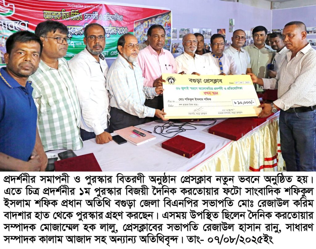 বগুড়া সংবাদ : বগুড়া প্রেসক্লাবের আয়োজনে ৩৬ জুলাই স্মরণে ৫ দিনব্যাপী আলোকচিত্র-ভিডিও প্রদর্শনী ও প্রতিযোগীতার সমাপনি ও পুরস্কার বিতরণী অনুষ্ঠান ৭ আগস্ট (বৃহস্পতিবার) বিকেলে প্রেসক্লাবের নতুন ভবনে অনুষ্ঠিত হয়।