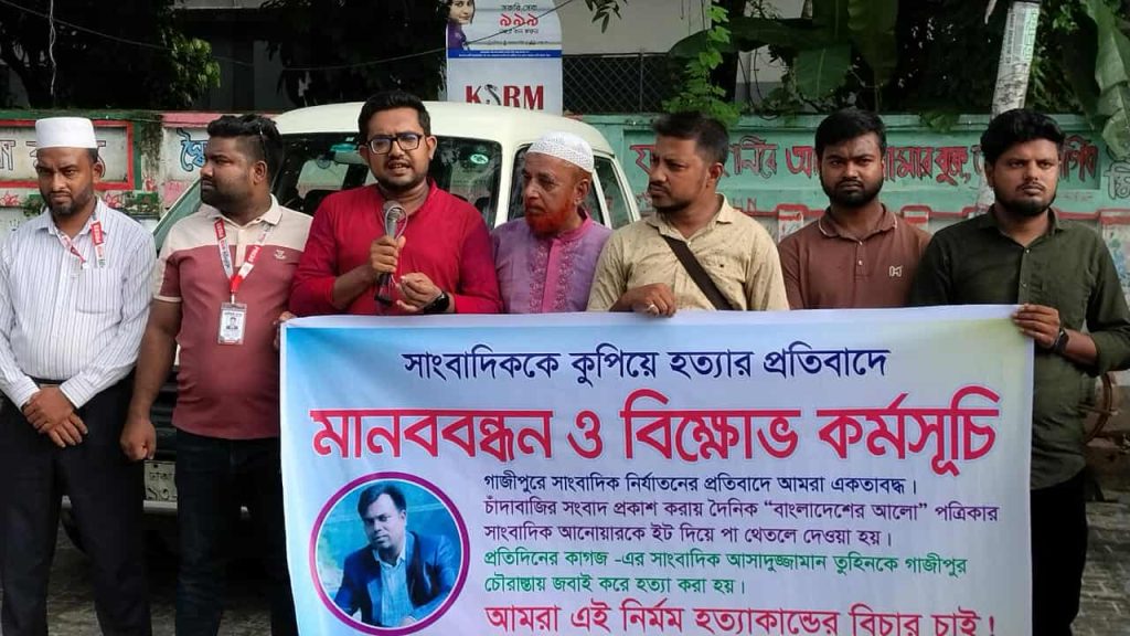 বক্তারা জানান, গত ৭ আগস্ট সাংবাদিক আসাদুজ্জামান তুহিন “চাঁদাবাজির বিরুদ্ধে” একটি অনুসন্ধানী ভিডিও প্রতিবেদন প্রকাশ করেন। এর জেরে ওইদিনই গাজীপুর চৌরাস্তায় দুর্বৃত্তরা তাকে কুপিয়ে হত্যা করে। একই হামলায় আহত হন ‘বাংলাদেশের আলো’ পত্রিকার সাংবাদিক আনোয়ার, যিনি বর্তমানে গুরুতর অবস্থায় চিকিৎসাধীন।