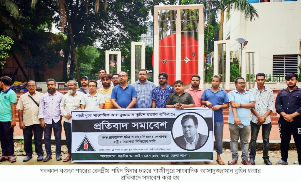 বগুড়া সংবাদ: গাজীপুরে সাংবাদিক আসাদুজ্জামান তুহিন হত্যার প্রতিবাদে বগুড়ায় প্রতিবাদ সমাবেশ করা হয়েছে। দ্রুত ট্রাইব্যুনাল গঠন ও সাংবাদিকদের পেশাগত রাষ্ট্রীয় নিরাপত্তা নিশ্চিতের দাবি জানিয়েছেন সাংবাদিকরা।