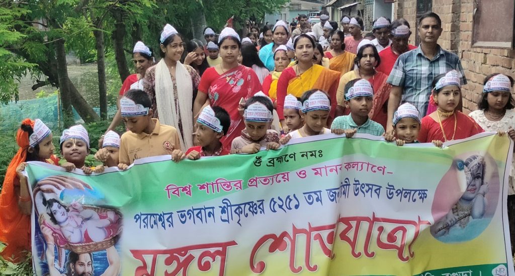 বগুড়া সংবাদ : বগুড়ার আদমদীঘিতে উৎসবমূখর পরিবেশে পরমেশ্বর ভগবান শ্রীকৃষ্ণের ৫২৫১তম জন্মাষ্টমি পালিত হয়েছে। শনিবার সকালে আদমদীঘি চড়কতলা কেন্দ্রীয় রাধাগোবিন্দ মন্দির ও তালশন কেন্দ্রীয় কালিবাড়ি মন্দির হতে জন্মাষ্টমী উৎসব উপলক্ষে মঙ্গল শোভাযাত্রা বের হয়ে উপজেলার সদরের বিভিন্ন রাস্তা প্রদক্ষিণ শেষে চড়কতলা কেন্দ্রীয় রাধাগোবিন্দ মন্দিরে গিয়ে শেষ হয়। এরপর মন্দির প্রাঙ্গনে জন্মাষ্টমী উৎসব উদযাপন কমিটির সভাপতি বাদল কুমার মৈত্রের সভাপতিত্বে ও উপজেলা পূজা উদযাপন পরিষদের সাধারণ সম্পাদক মিহির কুমার সরকারের সঞ্চালনায় ধর্মীয় আলোচনা সভায় বক্তব্য রাখেন আদমদীঘি থানার উপ পরিদর্শক তরিকুল ইসলাম, বিএনপির নেতা ও সাংবাদিক খন্দকার মেহেদী হাসান, চড়কতলা রাধাগোবিন্দ মন্দিরের সভাপতি ও পূজা উদযাপন ফ্রন্ট নেতা কানাই চন্দ্র প্রামানিক, মৃনাল কুমার সরকার, হিন্দু সম্প্রদায়ের নেতা নিতীশ চন্দ্র পাল, পূজা উদযাপন পরিষদ নেতা মোহন্ত সরকার, উদয় সরকার, মদন সরকার, ব্যাটেল মৈত্র, বলাই কুন্ডু, সুভাষ সরকার, জগাই কুন্ডু, রাধা মাধব মন্দির কমিটির নেতা হারান চন্দ্র প্রমূখ।