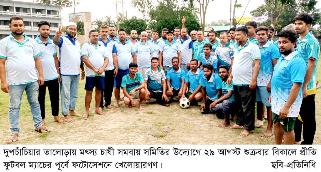 বগুড়া সংবাদ : দুপচাঁচিয়া উপজেলার তালোড়ায় মৎস্য চাষী সমবায় সমিতির উদ্যোগে প্রীতি ফুটবল ম্যাচ ও ধীর গতিতে মোটর সাইকেল চালনা প্রতিযোগিতা অনুষ্ঠিত হয়েছে। গত ২৯ আগস্ট শুক্রবার বিকালে তালোড়া আলতাফ আলী উচ্চ বিদ্যালয় মাঠে এ প্রীতি ফুটবল ম্যাচ অনুষ্ঠিত হয়। এতে তালোড়া মৎস্য চাষী সমবায় সমিতির সদস্যগণ ও মৎস্য পরিবহনের চালকগণ অংশ নেয়। ফুটবল ম্যাচ পরিচালনা করেন তালোড়া আলতাফ আলী উচ্চ বিদ্যালয়ের সহকারি শিক্ষক একেএম আব্দুল মাহাবুব রিন্টু। এসময় সমিতির সভাপতি ও তালোড়া আলতালী উচ্চ বিদ্যালয়ের প্রধান শিক্ষক সামছুল ইললাম টুটুল, সাধারণ সম্পাদক ইউনুস আলী সাখিদার, উপদেষ্টা আব্দুল গোফ্ফার আকন্দ লুটু, রাকিবুল হাসান রাকিব, শহীদুল ইসলাম সহ মৎস্য চাষী সমবায় সমিতির সদস্যগণ, মৎস্য পরিবহন চালকগণ, মৎস্য শিকারীগণ এবং ফুটবল প্রেমী দর্শকগণ উপস্থিত ছিলেন। উল্লেখ্য এ প্রীতি ফুটবল ম্যাচে তিনটি দল অংশ নেয়। এদিন সকাল ১০ টায় মৎস্য পরিবহন চালক ও মৎস্য শিকারীগণের মধ্যে প্রীতি ফুটবল ম্যাচের প্রথম পর্ব অনুষ্ঠিত হয়। এতে মৎস্য পরিবহন চালক দল বিজয়ী হয়। বিকালে মৎস্য পরিবহন চালকগণের সঙ্গে মৎস্য চাষী সমবায় সমিতির সদস্যদের মধ্যে চূড়ান্ত এ প্রীতি ফুটবল ম্যাচ অনুষ্ঠিত হয়। নির্ধারিত সময়ে এ খেলা চললেও কোন পক্ষই গোল না করায় অমীমাংসিত ভাবে এ প্রীতি ফুটবল ম্যাচ শেষ হয়। বিকালে প্রীতি ফুটবল ম্যাচের পূর্বে ধীর গতিতে মোটর সাইকেল খেলা অনুষ্ঠিত হয়।