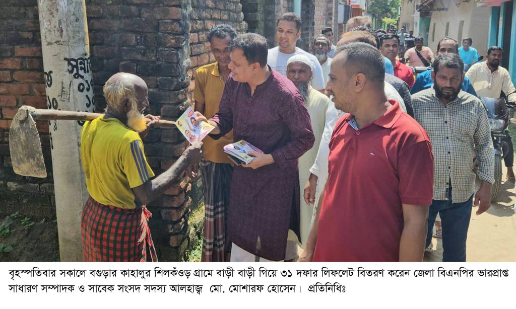 কবর জিয়ারত শেষে অত্র গ্রামের বাড়ী বাড়ী গিয়ে রাষ্ট্রকাঠামো মেরামতের ৩১ দফার লিফলেট বিতরণ করেন কেন্দ্রীয় কৃষকদলের সিনিয়র যুগ্ম সাধারণ সম্পাদক, বগুড়া জেলা বিএনপির ভারপ্রাপ্ত সাধারণ সম্পাদক ও কাহালু-নন্দীগ্রাম এলাকার সাবেক সংসদ সদস্য আলহাজ্ব মো. মোশারফ হোসেন। এ সময় উপস্থিত ছিলেন কাহালু উপজেলা বিএনপির সাংগঠনিক সম্পাদক আব্দুল মোমিন, নারহট্র ইউনিয়ন বিএনপির সভাপতি ইদ্রিস আলী, সাধারণ সম্পাদক এ কে এম রায়হান, সাংগঠনিক সম্পাদক আব্দুল গফুর, বিএনপিনেতা জাহাঙ্গীর আলম (তোতা), ফারুক হোসেন, উপজেলা স্বেচ্ছাসেবক দলের আহবায়ক আবুল কালাম আজাদ, সদস্য সচিব ফাহিম আহম্মেদ সুমন, উপজেলা ছাত্রদলের সভাপতি মুরাদ আহম্মেদ মধু, সিনিয়র সহ-সভাপতি রাকিব ইমতিয়াজ শাওন, সিনিয়র যুগ্ম সাধারণ সম্পাদক মোস্তফা আমীর রেজওয়ান স্বাধীন, যুবদলনেতা ফরহাদ বাবু, কৃষকদলনেতা নাজু সহ উপজেলা, পৌর ও ইউনিয়ন বিএনপি এবং অঙ্গ সহযোগী সংগঠনের নেতৃবৃন্দ। এছাড়াও সাবেক এম পি আলহাজ্ব মো. মোশারফ হোসেন শিলকঁওড় মাদ্রাসা ও শিলকঁওড় সরকারি প্রাথমিক বিদ্যালয়ের শিক্ষক/শিক্ষিকা ও শিক্ষার্থীদের সাথে মতবিনিময় করেন।