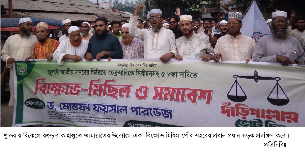 বগুড়া সংবাদ : বাংলাদেশ জামায়াতে ইসলামীর কেন্দ্রীয় কর্মসুচীর অংশ হিসেবে শুক্রবার বিকেলে কাহালুতে জামায়াতের উদ্যোগে এক বিক্ষোভ মিছিল অনুষ্ঠিত হয়।