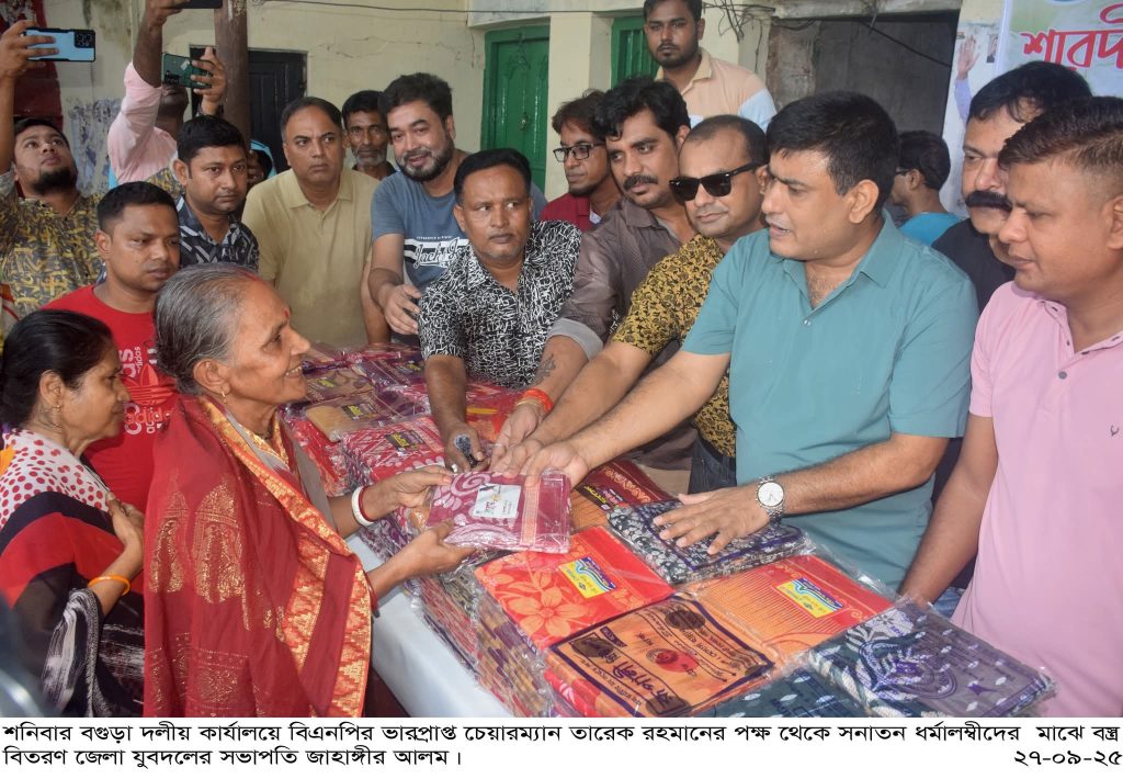এসময় তিনি বলেন, ঐতিহ্যগতভাবে সকলের সহযোগিতায় শারদীয় দুর্গোৎসব নির্বিঘেœ উদযাপনের মাধ্যমে এদেশে ধর্মীয় সম্প্রতির এক অনুপম দৃষ্টান্ত ইতোমধ্যেই সুপ্রতিষ্ঠিত হয়েছে।কিন্তু সাম্প্রতিক অতীতে পলাতক বিগত স্বৈরশাসনের সুবিধাভোগীরা দুর্গোৎসবের সময় হীন ও অসৎ রাজনৈতিক উদ্দেশ্যে বিভিন্ন অপকর্মের মাধ্যমে একাধিকবার ঐতিহ্যগতভাবে প্রতিষ্ঠিত এই সাম্প্রদায়িক সম্প্রীতি বিনষ্ট করে একটি সংঘাতময় পরিস্থিতি সৃষ্টির অপচেষ্টা চালিয়েছে।স্বৈরাচারের পতন হলেও তাদের ষড়যন্ত্রের অবসান যে হয়নি তার জলজ্যান্ত উদাহরণ আমরা সাম্প্রতিক সময়ে দেখেছি।তিনি আরোও বলেন, এবারের শারদীয় দুর্গোৎসবকে সামনে রেখে এমন যেকোন অপচেষ্টার বিরুদ্ধে আমাদের সর্বোচ্চ সতর্কতা ও প্রতিরোধের প্রস্ততি রাখতে হবে। বাংলাদেশ জাতীয়তাবাদ দল-বিএনপি, যুবদল সহ সকল অঙ্গ ও সহযোগী সংগঠনকে সমন্বয়ের মাধ্যমে সর্বস্তরের জনগণের সহায়তায় সনাতন ধর্মাবলম্বীদের দুর্গোৎসব নির্বিঘেœ উদযাপনে সর্বোচ্চ সহযোগিতা প্রদান করতে হবে। এসময় উপস্থিত ছিলেন জেলা যুবদলের সহ-সভাপতি ফেরদৌস আজম সুমন, সবুজ দেওয়ান, যুগ্ম-সাধারণ সম্পাদক ইমরান হোসেন, সহ-সাধারণ সম্পাদক, আনিসুল হক, সাংগঠনিক সম্পাদক হারুনুর রশিদ সুজন, প্রচার সম্পাদক রাশেদুল ইসলাম রাশেদ, সহ-প্রচার সম্পাদক এস এম রিপন, সহ-দপ্তর সম্পাদক মিনহাজুল ইসলাম তুহিন, সহ-শ্রম সম্পাদক সোহাগ মাহমুদ, সহ-আইন বিষয়ক সম্পাদক মাহমুদুল হাসান জিতু, শহর যুবদলের সাংগঠনিক সম্পাদক সৌরভ হাসান শিবলু, দপ্তর সম্পাদক সজল হাসান, সদর উপজেলা যুবদলের যুবনেতা গোলাম রব্বানী জায়দার সহ, পূজা উদযাপন ফ্রন্ট কেন্দ্রীয় কমিটির সহ-সাংগঠনিক সম্পাদক ( রংপুর ) বিজয় পান্ডে, বগুড়া পূজা উদযাপন ফ্রন্ট কমিটির আহবায়ক শ্রী অতুল চন্দ্র দাস, যুগ্ম আহ্বায়ক শ্রী সুজিত প্রসাদসহ বিভিন্ন ইউনিটের নেতৃবৃন্দ।