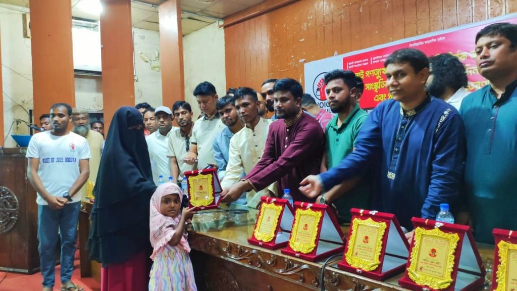 আলোচনা সভা শেষে নেতৃবৃন্দ বগুড়ার শহিদ পরিবারের সদস্যদের সম্মাননা স্মারক প্রদান করেন। এছাড়া জুলাই অভ্যুত্থানের স্মৃতিবিজড়িত ছবি ও ভিডিও নিয়ে আয়োজিত “অভ্যুত্থানের দিনগুলি” প্রতিযোগিতার বিজয়ীদের মাঝে পুরস্কার তুলে দেওয়া হয়।