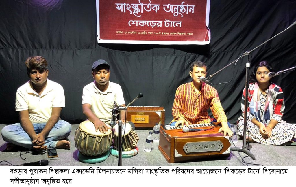 বগুড়া সংবাদ : বগুড়ায় মন্দিরা সাংস্কৃতিক পরিষদের আয়োজনে ‘শিকড়ের টানে’ শিরোনামে সঙ্গীতানুষ্ঠান অনুষ্ঠিত হয়েছে। শনিবার (২৭ সেপ্টেম্বর) রাত ৮টায় বগুড়া শহরের পুরাতন শিল্পকলা একাডেমির মিলনায়তনে বর্ণমালা মঞ্চে এই আয়োজন অনুষ্ঠিত হয়।