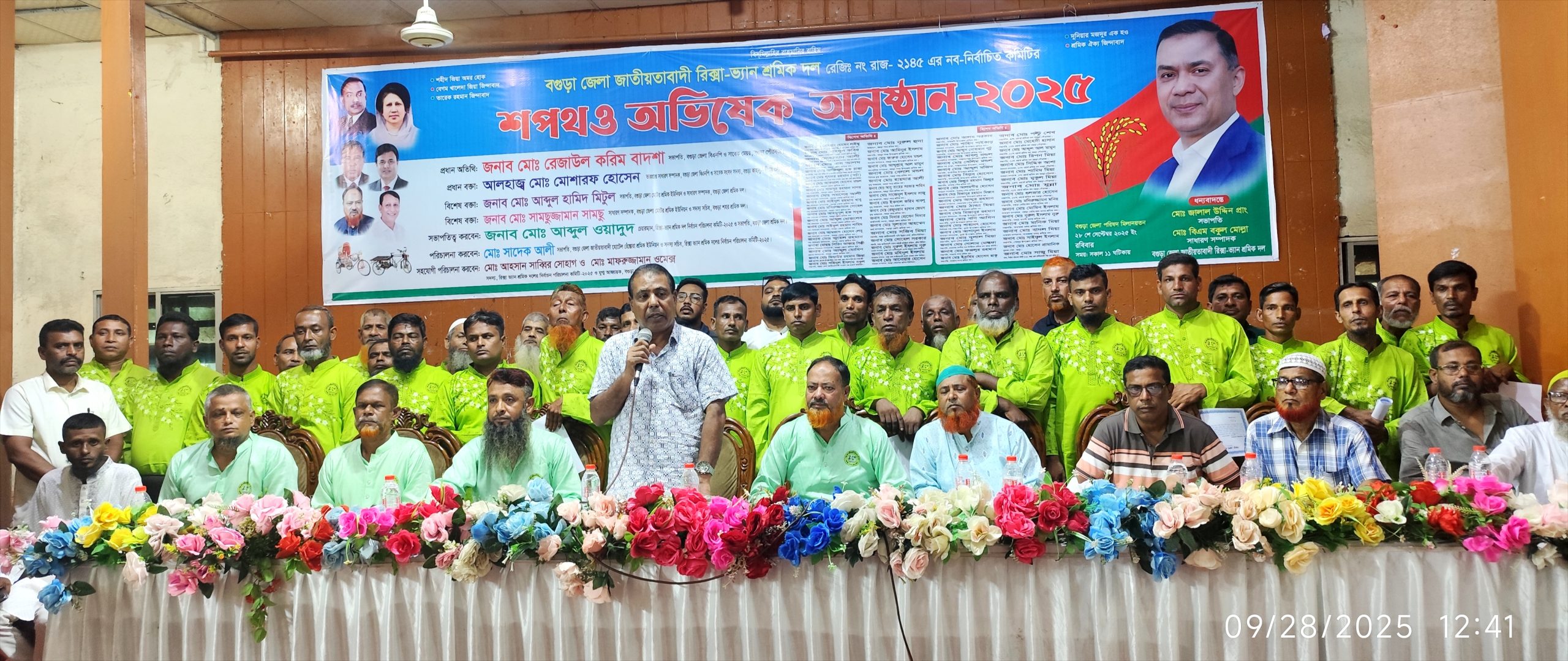 বগুড়া সংবাদ : আজ রবিবার সকাল ১১ টায় জেলা পরিষদ মিলনায়তন জেলা জাতীয়তাবাদী রিক্সা, ভ্যান শ্রমিক দল রেজি নং রাজঃ ২১৪৫ এর নব-নির্বাচিত নেতৃবৃন্দের শপথ ও অভিষেক অনুষ্ঠান অনুষ্ঠিত হয়। উক্ত সভায় সভাপতিত্ব করেন, বগুড়া জেলার শ্রমিক দলের সভাপতি ও রিক্সা, ভ্যান শ্রমিক দলের নির্বাচন পরিচালনা কমিটি ২০২৫ এর চেয়ারম্যান আব্দুল ওয়াদুদ। অভিষেক অনুষ্ঠানের প্রধান অতিথি হিসেবে উপস্থিত ছিলেন, জেলা বিএনপি’র সভাপতি ও পৌরসভার সাবেক মেয়র রেজাউল করিম বাদশা। বিশেষ বক্তা জেলা মোটর শ্রমিক ইউনিয়নের সাধারণ সম্পাদক ও শহর শ্রমিক দলের সদস্য সচিব সামছুজ্জামান সামছু। অনুষ্ঠান পরিচালনা করেন, সাদেক আলী, আহসান সাব্বির সোহাগ, মাফরুজ্জামান ওমেক্স অনুষ্ঠানে, বিশেষ অতিথি হিসেবে উপস্থিত ছিলেন শ্রমিক নেতা এস আলম, আজিজুল হক রাজা, আফজাল হোসেন, জিয়াউর রহমান জিয়া, আব্দুল মোমিন। শহর শ্রমিক দলের আহবায়ক নুরুল হুদা, শ্রমিক নেতা মহিদুল ইসলাম, আব্দুস সোবহান পুটু, বাবলু মন্ডল, সেলিম মন্ডল, মুন্না, পল্টু শেখ, সিদ্দিক আশা, রিপন মিয়া, মনিরুজ্জামান মনির, জিল্লুর রহমান, বনি আমিন, শাহাদ হোসেন, আশাদুল ইসলাম, মিজানুর রহমান, বেলাল মীর, সাজেদুর রহমান সাজু, আল আমিন হোসেন, দিদার হোসেন, আশরাফুল ইসলাম পুটু, মিজানুর রহমান মিজান, আনোয়ার হোসেন, রাজু মিয়া রিক্সা, ভ্যান শ্রমিক দলের সভাপতি জালাল উদ্দিন প্রামানিক, সাধারণ সম্পাদক বিএম বকুল, সাংগঠনিক সম্পাদক আল আমিন হোসেন, নব-নির্বাচিত সকল নেতৃবৃন্দ উপস্থিত ছিলেন।