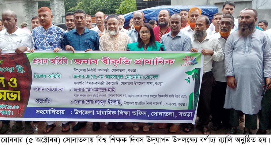 বগুড়া সংবাদ : নানা আয়োজনে রোববার (৫ অক্টোবর) সোনাতলায় উপজেলা মাধ্যমিক শিক্ষা দপ্তরের সহযোগিতায় বিশ্ব শিক্ষক দিবস উদ্যাপিত হয়েছে। বেলা ১২টায় উপজেলা পরিষদ চত্বর থেকে বর্ণাঢ্য র্যালি বের হয়ে সোনাতলা পৌরসভায় গিয়ে মিলিত হয়। পরে পৌর অডিটোরিয়ামে উপজেলা মাধ্যমিক শিক্ষা কর্মকর্তা শেখ নজমুল ইসলামের সভাপতিত্বে ও শিক্ষক রুহুল আমিন রঞ্জুর সঞ্চালনায় অতিথিদের ফুল দিয়ে বরণ ও আলোচনা সভা অনুষ্ঠিত হয়। উপজেলা নির্বাহী কর্মকর্তা স্বীকৃতি প্রামানিক আলোচনা সভায় প্রধান অতিথির বক্তব্য দেন। বিশেষ অতিথির বক্তব্য দেন শিক্ষক-কর্মচারী ঐক্যজোট সোনাতলা উপজেলা কমিটির সভাপতি একেএম আহসানুল মোমেনীন সোহেল,সাধারণ সম্পাদক মোঃ আব্দুল হাই, উপাধ্যক্ষ শাহ জালাল,প্রভাষক মোত্তালিব হোসেন,শিক্ষক আহসান কবির,শরিফুল ইসলাম ও তারাজুল ইসলাম প্রমুখ। উপস্থিত ছিলেন অধ্যক্ষ আশরাফুল ইসলাম, অধ্যক্ষ ছাইদুর রহমান, ভারপ্রাপ্ত অধ্যক্ষ শফিকুল ইসলাম,শিক্ষক আব্দুর রশিদ,ইন্তেজার রহমান বেপারী,শফিকুল ইসলাম মোকাররম হোসেন,দেলোয়ার হোসেন,মোনারুল ইসলাম ও আব্দুল হান্নান-সহ অনেকে।