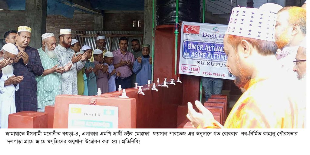 বগুড়া সংবাদ : বাংলাদেশ জামায়াতে ইসলামী মনোনীত বগুড়া-৪, (কাহালু-নন্দীগ্রাম) এলাকার সংসদ সদস্য প্রার্থী ও ইন্টারন্যাশলাল ইসলামিক ফেডারেশন অফ স্টুডেন্টস অর্গানাইজেশন (ইফসো) এর মহাসচিব ডক্টর মোস্তফা ফয়সাল পারভেজ এর নিজস্ব অনুদানে নব-নির্মিত কাহালু পৌরসভার দলগাড়া জামে মস্জিদের অযুখানা উদ্বোধন করা হয়।