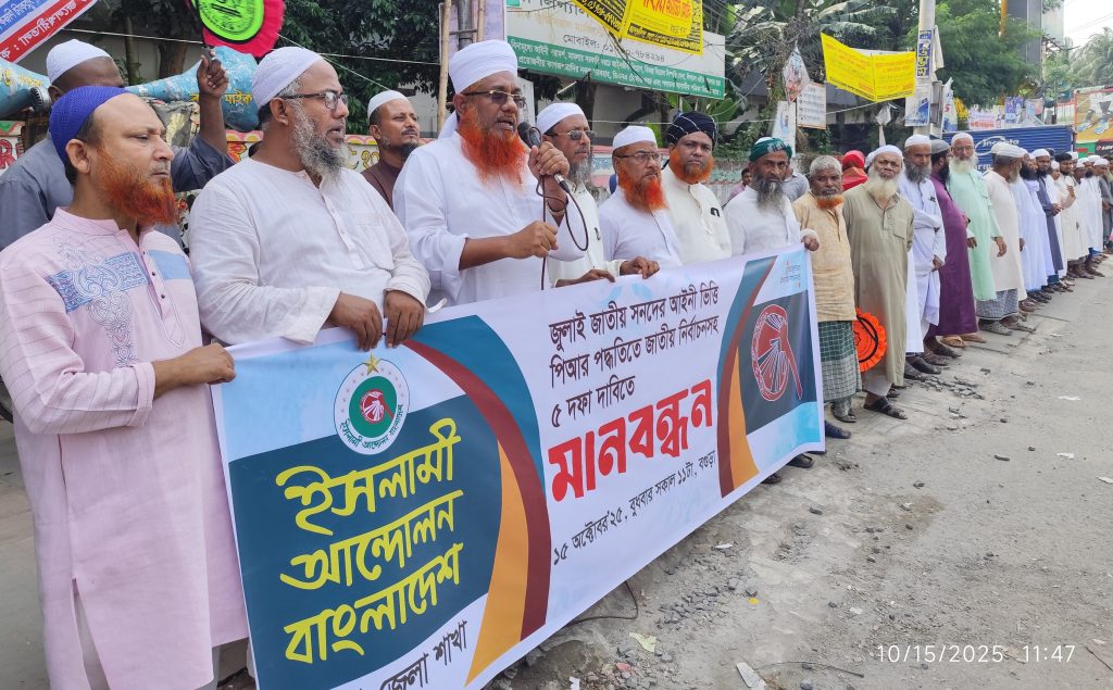 মানববন্ধনে আরো বক্তব্য রাখেন ইসলামী আন্দোলন বাংলাদেশ, বগুড়া জেলা শাখার জয়েন্ট সেক্রেটারী— অধ্যাপক এমদাদুল হক, সাংগঠনিক সম্পাদক— অধ্যাপক জিয়াউর রহমান জিয়া, ওলামা মাশায়েখ আইম্মা পরিষদ, বগুড়া জেলা শাখার সাধারণ সম্পাদক—মাও: রেজাউল করীম, যুব আন্দোলনের সভাপতি—মো: সোহরাব হোসেন, শ্রমিক আন্দোলনের সেক্রেটারী—মো: আবু সাঈদ, ছাত্র আন্দোলনের সাংগঠনিক সম্পাদক ও জুলাই যোদ্ধা—ছাত্র নেতা হাসান আহমাদ রাবি প্রমুখ।