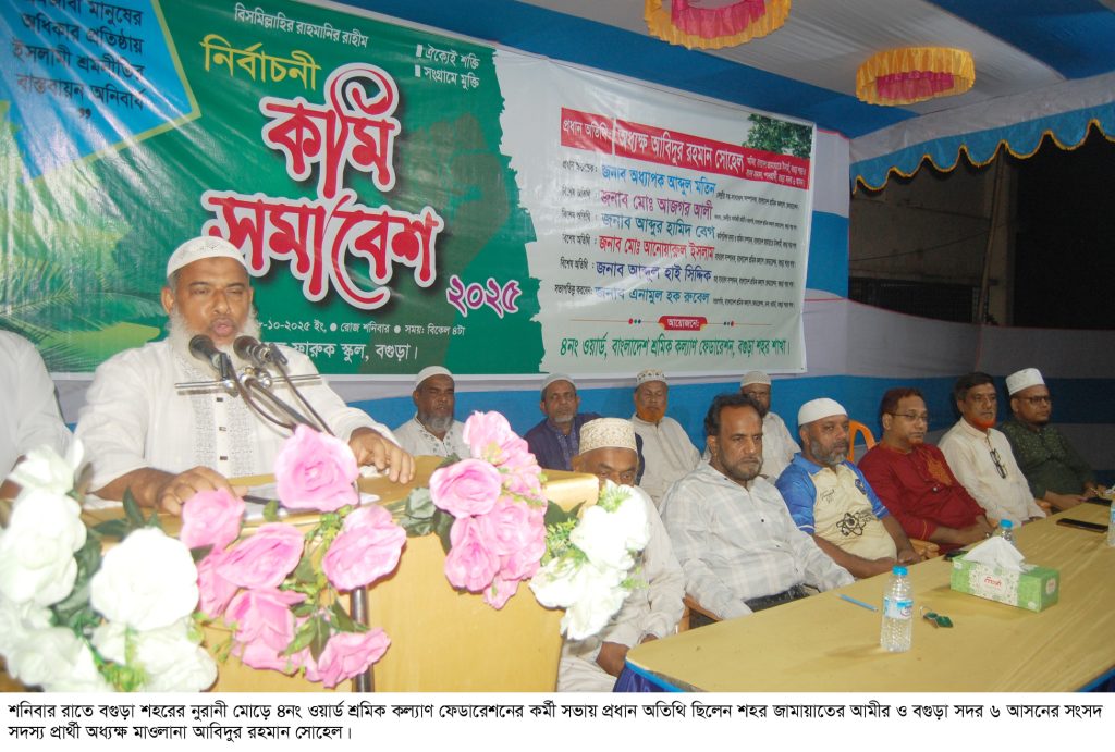 বগুড়া সংবাদ : শনিবার বগুড়া শহরের নুরানী মোড়ে ৪নং ওয়ার্ড শ্রমিক কল্যাণ ফেডারেশনের কর্মী সভা ওমর ফারুক স্কুল মাঠে অনুষ্ঠিত হয়। এনামুল হক রুবেলের সভাপতিত্বে কর্মীী সভায় প্রধান অতিথি ছিলেন শহর জামায়াতের আমীর ও বগুড়া সদর ৬ আসনের সংসদ সদস্য প্রার্থী অধ্যক্ষ মাওলানা আবিদুর রহমান সোহেল। প্রধান আলোচক ছিলেন শ্রমিক কল্যাণ ফেডারেশন কেন্দ্রীয় সহ-সাধারণ সম্পাদক অধ্যাপক আব্দুল মতিন। বিশেষ অতিথি ছিলেন হর জামায়াতের নায়েবে আমীর মাওলানা আব্দুল হালিম বেগ, শ্রমিক কল্যাণ ফেডারেশন শহর শাখার সভাপতি মোঃ আজগর আজগর আলী, আব্দুর হামিদ বেগ, সেলিম রেজা, অধ্যক্ষ ইকবাল হোসেন, মোঃ আনোয়ারুল ইসলাম, হারুনার রশিদ আব্দুল হাই সিদ্দিক প্রমুখ। সভায় প্রধান অতিথি বলেন, ইসলামী শ্রমনীতির বাস্তবায়ন অনিবার্য। ইসলামী শ্রমনীতি ছাড়া মানুষের ভাগোন্নয়ন সম্ভব নয়। বৈষম্যমুক্ত সমাজ গঠনে সবাইকে কুরআনের শাসন প্রতিষ্ঠায় আগামী নির্বাচনে দাড়িপাল্লায় ভোট দেওয়ার আহবান জানান।
