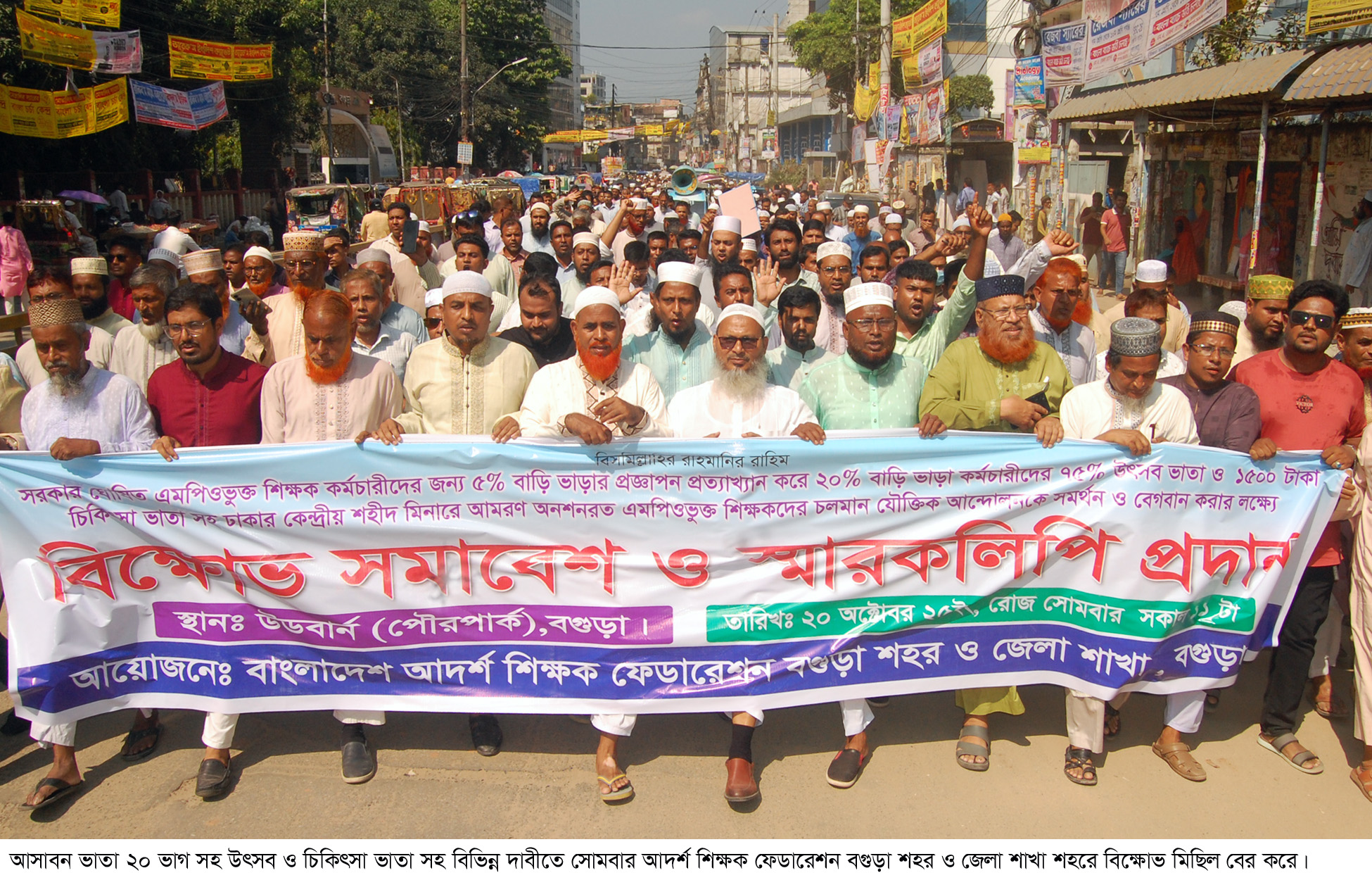 ক্যাপশন: আবাসন ভাড়া ২০ শতাংশ সহ বিভিন্ন দাবীতে সোমবার বগুড়া আদর্শ শিক্ষক ফেডারেশন শহরে বিক্ষোভ মিছিল বের করে ও জেলা প্রশাসককে স্মারকলিপি প্রদান করে।
