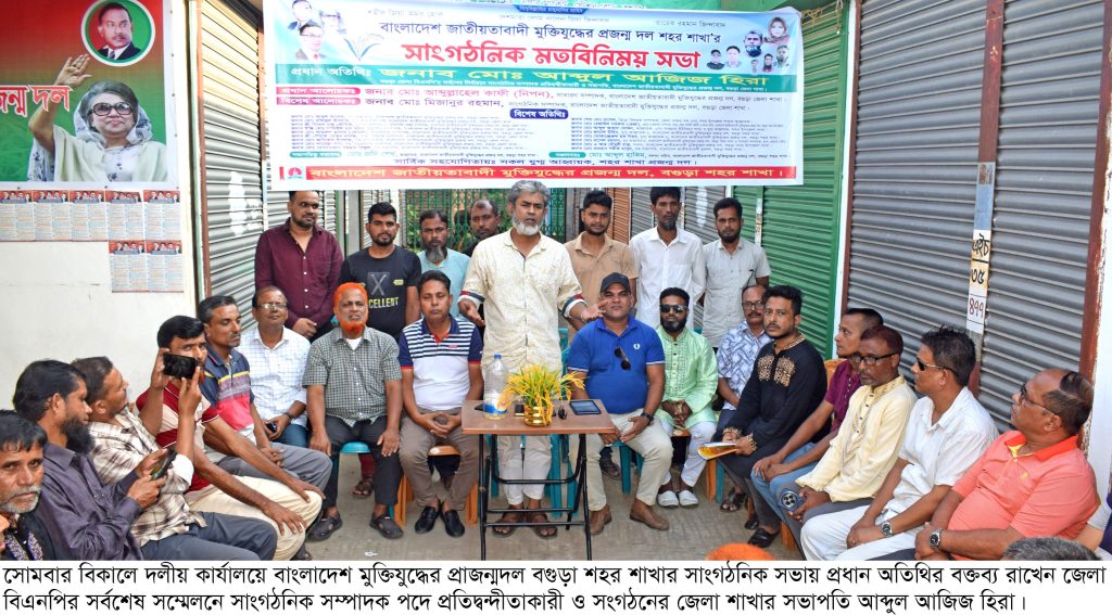 বগুড়া সংবাদ : বাংলাদেশ জাতীয়তাবাদী মুক্তিযুদ্ধের প্রজন্মদল বগুড়া জেলা শাখার সভাপতি ও জেলা বিএনপির সর্বশেষ সম্মেলনে সাংগঠনিক সম্পাদক পদে প্রতিদ্বন্দীতাকারী আব্দুল আজিজ হিরা বলেছেন আগামী নির্বাচনে বিএনপির ভারপ্রাপ্ত চেয়ারম্যান তারেক রহমানের নেতৃত্বে একক সংখ্যা গরিষ্ঠতা অর্জন করে সরকার গঠন করবে। তাই আমরা সকলে আমাদের দ্বিধা দ্বন্দ্ব ভুলে তারেক রহমান ঘোষিত ৩১ দফা বাস্তবায়নে ঐক্যবদ্ধ হয়ে একযোগে কাজ করতে হবে। তিনি গতকাল সোমবার মুক্তিযুদ্ধের প্রজন্মদল বগুড়া শহর শাখা আয়োজিত এক সাংগঠনিক সভায় উপরোক্ত কথাগুলো বলেন। শহরের সভাপতি জনি শেখ এর সভাপতিত্বে ও সদরের সদস্য সচিব এবং জেলার প্রচার ও প্রকাশনা সম্পাদক রেজাউল সরকার রেজার সঞ্চালনায় সভায় বক্তব্য রাখেন সংগঠনের জেলা শাখার সাধারণ সম্পাদক মোঃ আব্দুল্লাহেল কাফী নিপন, সাংগঠনিক সম্পাদক মোঃ মিজানুর রহমান মিজান, বগুড়া জেলা মুক্তিযুদ্ধের প্রজন্ম দলের সিনিয়র সহ-সভাপতি মোঃ আবুল কাসেম, সহ-সভাপতি মোঃ মোন্তেজার রহমান রিফুল, যুগ্ম সাধারণ সম্পাদক মোঃ রফিকুল ইসলাম রফিক, যুগ্ন সাধারণ সম্পাদক শ্রী নিরেশ চন্দ্র ভৌমিক, যুগ্মসাধারণ সম্পাদক ইঞ্জিনিয়ার মোঃ সামিউল হক সুমন, সাংগঠনিক সম্পাদক, মোঃ খায়রুল হাসান কোমল, শিক্ষা বিষয়ক সম্পাদক শ্রী গৌরাঙ্গ মোহন বসাক। এসময়ে উপস্থিত ছিলেন কোষাধ্যক্ষ জিন্নাতুল ইসলাম জিন্নাহ, অর্থ বিষয়ক সম্পাদক মোঃ আতিক, সদস্য মোঃ টুলু, সদস্য মোঃ এ আর চৌধুরী রাকু, যুগ্ন আহবায়ক মোঃ আহাদ আলী খোকন বগুড়া সদর উপজেলা ও সাবগ্রাম ইউনিয়নের আহবায়ক, মোঃ এজাজুল কাহালু উপজেলার আহবায়ক, মোঃ জামাল উদ্দিন যুগ্ন আহবায়ক, বগুড়া শহর শাখা,মোঃআমিনুল ইসলাম রানু সদর উপজেলা যুগ্ন আহবায়ক , মোঃ রানা, মোঃ নুর আলম লাহেরি পাড়া ইউনিয়ন,সিরাজুল ইসলাম, মোঃরাসেল,মোঃমামুন,মোঃ রিগ্যান । এছাড়াও বিভিন্ন পর্যায়ের নেতৃবৃন্দ উপস্থিত ছিলেন। সভা শেষে শহরের বিভিন্ন এলাকায় তারেক রহমান ঘোষিত ৩১ দফার লিফলেট বিতরণ করা হয়।