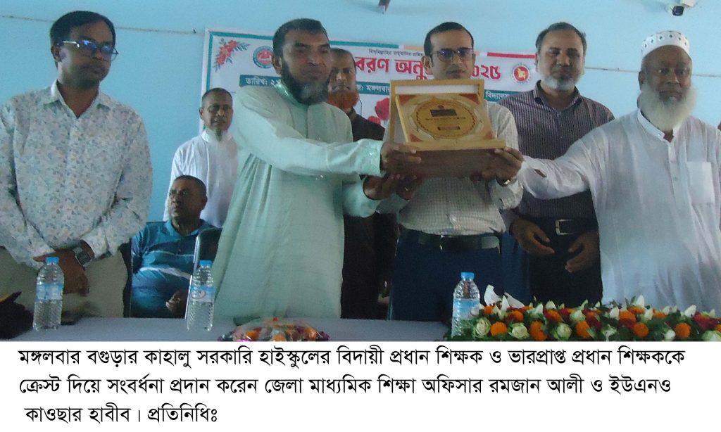 বিদায় ও বরণ অনুষ্ঠানে সভাপতিত্ব করেন কাহালু সরকারি মডেল উচ্চ বিদ্যালয়ের সভাপতি ও উপজেলা নির্বাহী অফিসার মো. কাওছার হাবীব।