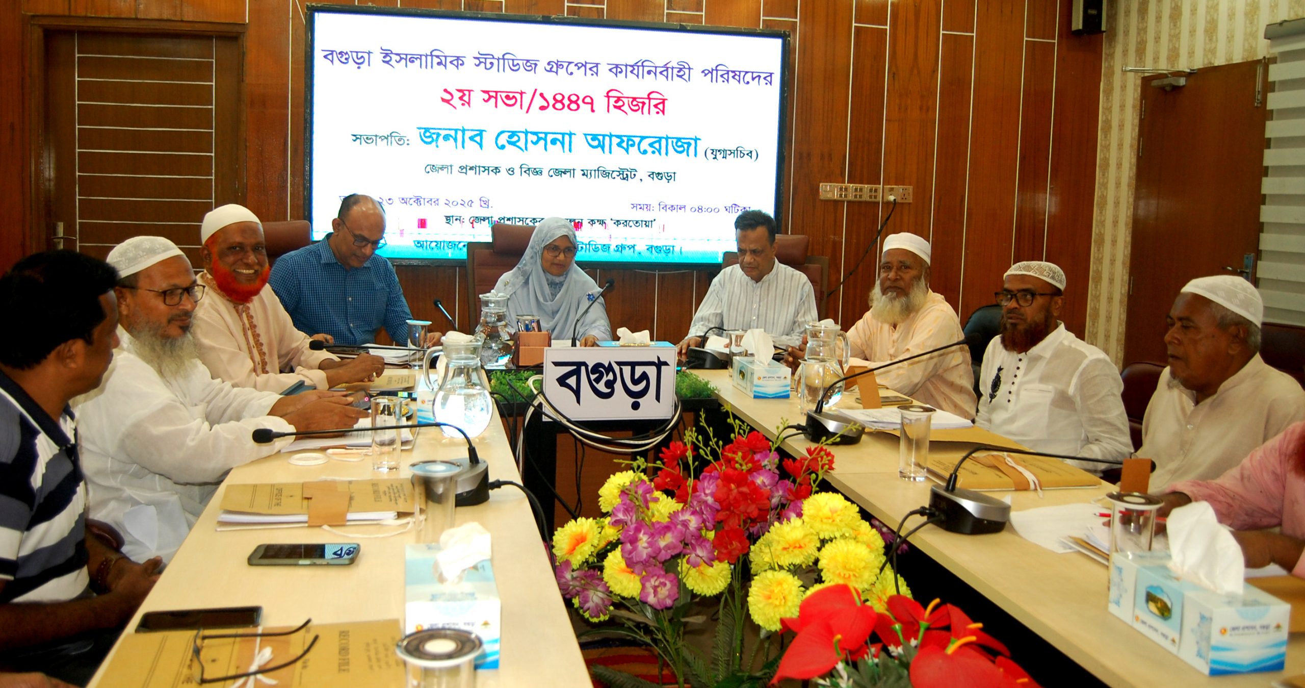বগুড়া সংবাদ : বৃহস্পতিবার বিকেলে বগুড়া জেলা প্রশাসকের সম্মেলন কক্ষে বগুড়া ইসলামিক স্টাডিজ গ্রæপের ২য় কার্য নির্বাহী সভা অনুষ্ঠিত হয়। সভায় সভাপতিত্ব করেন সংগঠনের সভাপতি ও জেলা প্রশাসক হোসনা আফরোজা। এ সময় উপস্থিত ছিলেন অতিরিক্ত জেলা প্রমাসক ও সংগঠনের সহ সভাপতি মেজবাউল করিম, সাধারন সম্পাদক ফজলুল বারী তালুকদার বেলাল, সহ সভাপতি অধ্যাপক আ স ম আব্দুল মালেক, আব্দুল খালিক, আবু বক্কর সিদ্দিক, আফজাল হোসেন, রুহুল আমীন, আব্দুল হান্নান, কাজি আবু বক্কর সিদ্দিক, ফজলে রাব্বি ডলার, আব্দুল আজিজ, তোফায়েল আহমেদ, মাহফুজুল হক, রফিকুল ইসলাম, মুফতি মাওলানা কাজী ফজলুল করিম, বগুড়া প্রেসক্লাবের সভাপতি রেজাউল হাসান রানু, মুফতি মাওলানা আব্দুল কাদের, ইসরাফিল হোসাইন, আরেফ বিল্লা বিলু প্রমুখ।