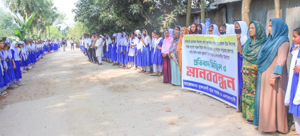 বগুড়া সংবাদ (জাহাঙ্গীর আলম লাকি গাবতলী বগুড়া) : বগুড়ার গাবতলী উপজেলার সুখানপুকুর ইউনিয়নের তেলিহাটা গ্রামের প্রাথমিক বিদ্যালয় থেকে মোস্তাফিজুর রহমান মেমোরিয়াল উচ্চ বিদ্যালয় পর্যন্ত রাস্তার সংযোগ নির্মাণে বাধা ও রাস্তার ওপর ঘর নির্মাণের প্রতিবাদে এলাকাবাসী, অভিভাবক ও ছাত্র -ছাত্রী মানববন্ধন ও প্রতিবাদ মিছিল করেছে।