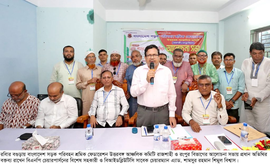 রবিবার বগুড়ার ইসলামপুর হরিগাড়িতে মোটর শ্রমিক ড্রাইভিং ট্রেনিং সেন্টারে বাংলাদেশ সড়ক পরিবহন শ্রমিক ফেডারেশন উত্তরবঙ্গ আঞ্চলিক কমিটি রাজশাহী ও রংপুর বিভাগের আলোচনা সভায় প্রধান অতিথির বক্তব্যে তিনি উপিরোক্ত কথা বলেন। বাংলাদেশ সড়ক পরিবহন শ্রমিক ফেডারেশনের সহ-সভাপতি মোঃ আব্দুল হামিদ মিটুলের সভাপতিত্বে প্রধান বক্তার বক্তব্য দেন বাংলাদেশ সড়ক পরিবহন শ্রমিক ফেডারেশন ভারপ্রাপ্ত সভাপতি আব্দুর রহিম বক্স দুদু। বিশেষ অতিথির বক্তব্য দেন বাংলাদেশ সড়ক পরিবহন শ্রমিক ফেডারেশনের ভারপ্রাপ্ত সাধারণ সম্পাদক আলহাজ্ব হুমায়ুন কবির খান। সভায় আরো বক্তব্য দেন রফিকুল ইসলাম, সাদাকালুত বারী, রাসেল মন্ডল, মুশফিকুর রহমান, শাহ আলম মুক্তি, সুলতান তালুকদার, হাসান আলী, মিল চন্দ্র বোষ, শ্রী বিনয় কুমার দেব, আব্দুল জব্বার, রফিকুল ইসলাম।