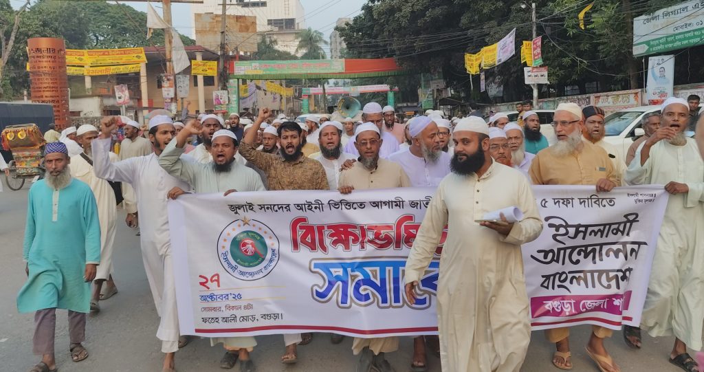 বাস্তবায়নের মাধ্যমে রাষ্ট্রকে পুনরুজ্জীবিত করি, ঐক্যের নতুন দিগন্ত উন্মোচন করি।” সমাবেশে আরো বক্তব্য রাখেন ইসলামী আন্দোলন বাংলাদেশ, বগুড়া জেলা সহ-সভাপতি-প্রিন্সিপাল মাও, আব্দুল মতিন, জয়েন্ট সেক্রেটারী- অধ্যাপক মুফতী এমদাদুল হক, যুগ্ম সাধারণ সম্পাদক- অধ্যাপক শাহজাহান তালুকদার, জাতীয় ওলামা মাশায়েখ আইম্মা পরিষদ, বগুড়া জেলা শাখার সাধারণ সম্পাদক-মাও: রেজাউল করীম, ইসলামী যুব আন্দোলনের সভাপতি-মো: সোহরাব হোসেন, শ্রমিক আন্দোলনের সাধারণ সম্পাদক-মো: আবু সাঈদ, ইসলামী ছাত্র আন্দোলনের সাধারণ সম্পাদক- মুহাম্মাদ সোহেল