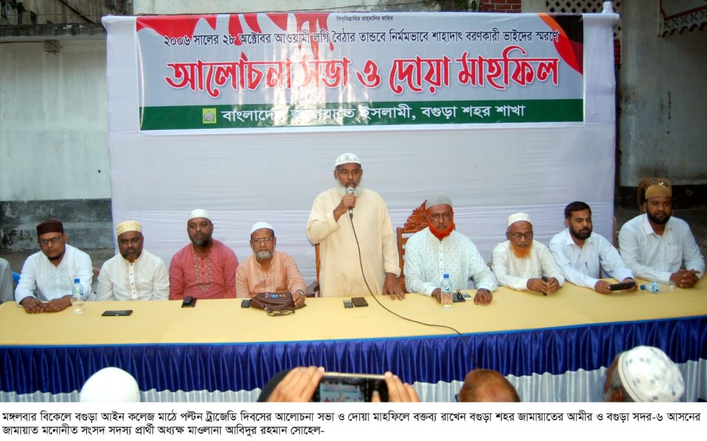 ক্যাপশন: মঙ্গলবার বিকেলে বগুড়া আইন কলেজ মাঠে পল্টন ট্রাজেডি দিবসের আলোচনা সভা ও দোয়া মাহফিলে বক্তব্য রাখেন বগুড়া শহর জামায়াতের আমীর ও বগুড়া সদর-৬ আসনের জামায়াত মনোনীত সংসদ সদস্য প্রার্থী অধ্যক্ষ মাওলানা আবিদুর রহমান সোহেল-