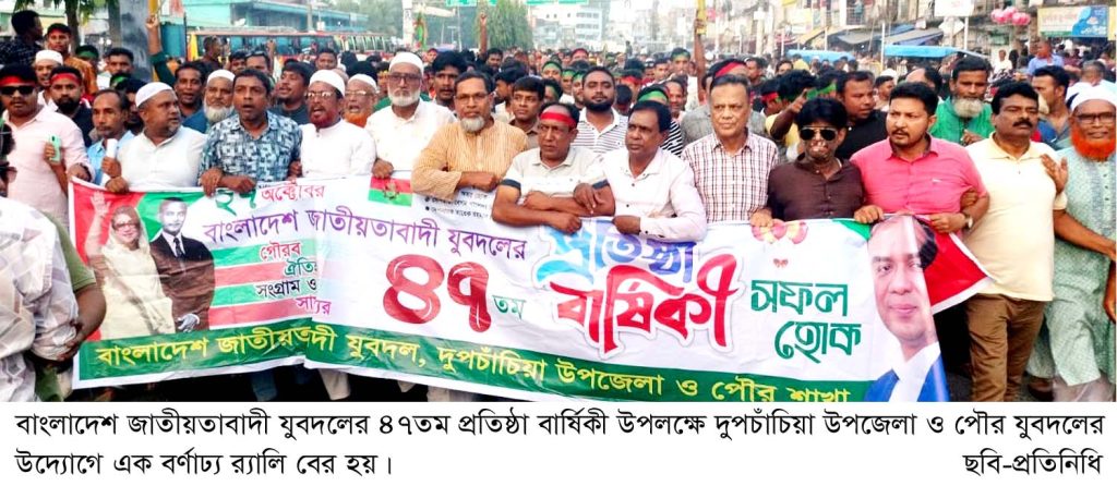 বগুড়া সংবাদ : বাংলাদেশ জাতীয়তাবাদী যুবদলের ৪৭তম প্রতিষ্ঠা বার্ষিকী উপলক্ষে ২৮অক্টোবর মঙ্গলবার দুপচাঁচিয়া উপজেলা ও পৌর যুবদলের উদ্যোগে দিনব্যাপী বিভিন্ন কর্মসুচীর মধ্য দিয়ে পালিত হয়েছে। কর্মসূচীর মধ্য ছিল জাতীয় ও দলীয় পতাকা উত্তোলন, শহীদ জিয়াউর রহমানের প্রতিকৃতিতে পুষ্পমাল্য অর্পণ, ফ্রি মেডিকেল ক্যাম্প, স্বেচ্ছায় রক্তদান কর্মসূচী, বৃক্ষরোপন, মাছের পোনা অবমুক্ত করণ, প্রতিবন্ধীদের মাঝে খাবার বিতরণ, আলোচনা সভা ও বর্ণাঢ্য র্যালি। এদিন বিকেলে দলীয় কার্যালয়ের সামনে উপজেলা যুবদলের আহবায়ক আফছার আলীর সভাপতিত্বে ও পৌর যুবদলের সিনিয়র যুগ্ম আহবায়ক নাঈম কবিরাজ ও যুবদল নেতা আশরাফুল আলমের যৌথ পরিচালনায় এক আলোচনা সভায় বক্তব্য রাখেন বগুড়া জেলা বিএনপির সাবেক সাধারণ সম্পাদক ফজলুল বারী তালুকদার বেলাল, জেলা বিএনপির সহসভাপতি ও আদমদীঘি উপজেলা বিএনপির সভাপতি আব্দুল মুহিত তালুকদার, উপজেলা বিএনপির সভাপতি একেএম মনিরুল ইসলাম খান স্বপন প্রমুখ। এসময় উপস্থিত ছিলেন উপজেলা বিএনপির সাবেক সভাপতি আব্দুল হামিদ, উপজেলা বিএনপির সাধারণ সম্পাদক আব্দুর রহিম, সাবেক সাধারণ সম্পাদক ও সাবেক পৌর মেয়র জাহাঙ্গীর আলম, পৌর বিএনপির ভারপ্রাপ্ত সভাপতি এ্যাড. সাইফুর রহমান, সাধারণ সম্পাদক আখতারুজ্জামান তুহিন, উপজেলা বিএনপির সাংগঠনিক সম্পাদক মেশকাতুর রহমান মেশকাত, জান্নাতুল ফেরদৌস, পৌর বিএনপির সাংগঠনিক সম্পাদক জাহিদুর রহমান তালুকদার কাজল, উপজেলা যুবদলের যুগ্ম আহবায়ক মেশকাত আহম্মেদ, আব্দুস সবুর খন্দকার রাকিব, ইব্রাহীম আলী, উপজেলা ছাত্রদলের সাবেক সাধারণ সম্পাদক যুবদল নেতা আবু রায়হান, যুবদল নেতা মোবাইদুন নবী তিতাস, রাবু খান, জাহিদ হাসান রোস্তম, কাজী ইলিয়াছ কল্লোল, সবুজ শেখ, উপজেলা স্বেচ্ছাসেবকদলের আহবায়ক আব্দুর রাজ্জাক, সদস্য সচিব আব্দুল মান্নান, পৌর স্বেচ্ছাসেবকদলের আহবায়ক ওয়ালিউল ইসলাম পুটু, উপজেলা কৃষকদল নেতা মোখলেছার রহমান বাবু, মাহবুর রহমান মাফু, আয়েত আলী, উপজেলা জাসাসের সভাপতি নূর মোহাম্মাদ তালুকদার রুবেল, মহিলাদল নেত্রী আসফিয়া হায়াত সিলভা, উপজেলা শ্রমিকদলের সভাপতি আব্দুল মজিদ, পৌর ছাত্রদলের সভাপতি নাঈম সরদার সহ বিএনপি, যুবদল, ছাত্রদল ও অঙ্গ সহযোগী সংগঠনের নেতাকর্মী। আলোচনা সভা শেষে এক বর্ণাঢ্য র্যালি বের হয়ে উপজেলা সদরের বিভিন্ন রাস্তা প্রদক্ষি করে।