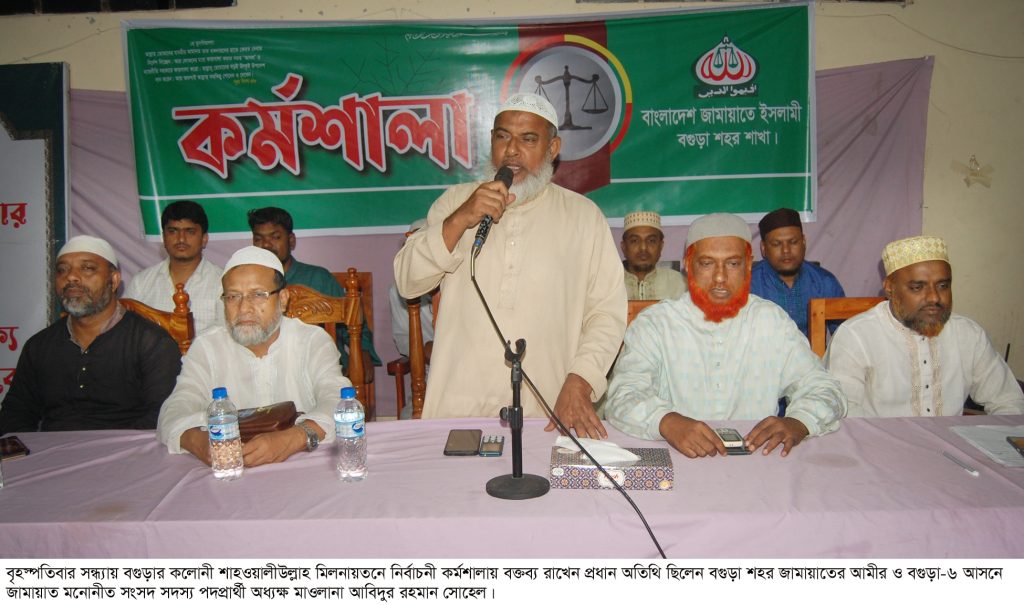 বগুড়া সংবাদ : গতকাল বৃহস্পতিবার সন্ধ্যায় বগুড়া শহরের কলোনী শাহওয়ালীউল্লাহ মিলনায়তনে বগুড়া সদর-৬ আসনের নির্বাচনী কর্মশালায় শহর নির্বাচনী পরিচালক অধ্যাপক আব্দুস সালাম তুহিনের সভাপতিত্বে অনুষ্ঠিত হয়। কর্মশালায় প্রধান অতিথি ছিলেন বগুড়া শহর জামায়াতের আমীর ও বগুড়া-৬ আসনে জামায়াত মনোনীত সংসদ সদস্য পদপ্রার্থী অধ্যক্ষ মাওলানা আবিদুর রহমান সোহেল। বিশেষ অতিথি ছিলেন শহর সেক্রেটারী অধ্যাপক আ. স. ম. আব্দুল মালেক, সহকারী সেক্রেটারী রফিকুল আলম, শ্রমিক নেতা আজগর আলী, দাওয়াহ ও প্রশিক্ষণ সম্পাদক মাওলানা হেদায়েতুল ইসলাম, প্রচার সম্পাদক অধ্যক্ষ ইকবাল হোসেন। কর্মশালায় আরো বক্তব্য রাখেন স্মার্ট টিম পরিচালক এনামুল হক রানা, দেলোয়ার হুসাইন সাঈদী, হেলাল উদ্দিন প্রমুখ। প্রধান অতিথি বলেন, সন্ত্রাস দুর্নীতি মুক্ত নতুন বাংলাদেশ গড়তে দেশের জনগণ এবার জামায়াতে ইসলামীকে বেছে নিবে। দেশের জনগণের পালস্ বুঝতে হবে, সকল শিক্ষা প্রতিষ্ঠানে ছাত্ররা ন্যায়ের পক্ষে ভোট দিয়েছে। এবার জাতীয় নির্বাচনেও ঘটাতে হবে। কুরআন বিজয়ের মাধ্যমে জামায়াতে ইসলামী একটি সুখী সমৃদ্ধশালী বাংলাদেশ গড়ে তুলতে চায়। কুরআনের দাওয়াত পৌঁছে দিতে জামায়াত কর্মীদের ময়দানে ঝাঁপিয়ে পড়তে হবে। আগামী নির্বাচনে অনেকেই আমাদের ভয় দেখায় কেন্দ্রে যেতে দিবেনা। হাত পা ভেঙ্গে দিবে। ভোটের কাজে মহিলাদের বাঁধা দিচ্ছে। আমরা বলতে চাই কোন রক্তচক্ষু জামায়াতের কর্মীরা ভয় পায় না। আপনারা সবাইকে ভোট কেন্দ্রে নিয়ে যাবেন এবং দাড়িপাল্লায় ভোট দিতে বলবেন। সমস্ত চাপ উপেক্ষা করে দল মত ধর্ম বর্ণ নির্বিশেষে সকল দায়িত্বশীলদের সমাজ পরিবর্তনে কাজ করতে হবে।