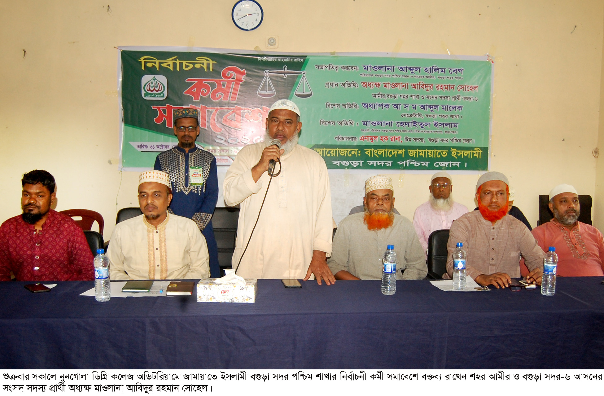 তিনি শুক্রবার সকালে নুনগোলা ডিগ্রি কলেজ অডিটরিয়ামে জামায়াতে ইসলামী বগুড়া সদর পশ্চিম জোনের নির্বাচনী কর্মী সমাবেশে প্রধান অতিথির বক্তব্যে এ কথা বলেন। বগুড়া সদর পশ্চিম জোন পরিচালক মাওলানা আব্দুল হালিম বেগের সভাপতিত্বে ও জোন সহকারী পরিচালক এনামুল হক রানার পরিচালনায় সমাবেশে বিশেষ অতিথি ছিলেন শহর সেক্রেটারী অধ্যাপক আ স ম আব্দুল মালেক, মাওলানা হেদায়েতুল ইসলাম, শ্রমিক নেতা আজগর আলী, প্রচার সম্পাদক অধ্যক্ষ ইকবাল হোসেন, আব্দুল হালিম ।