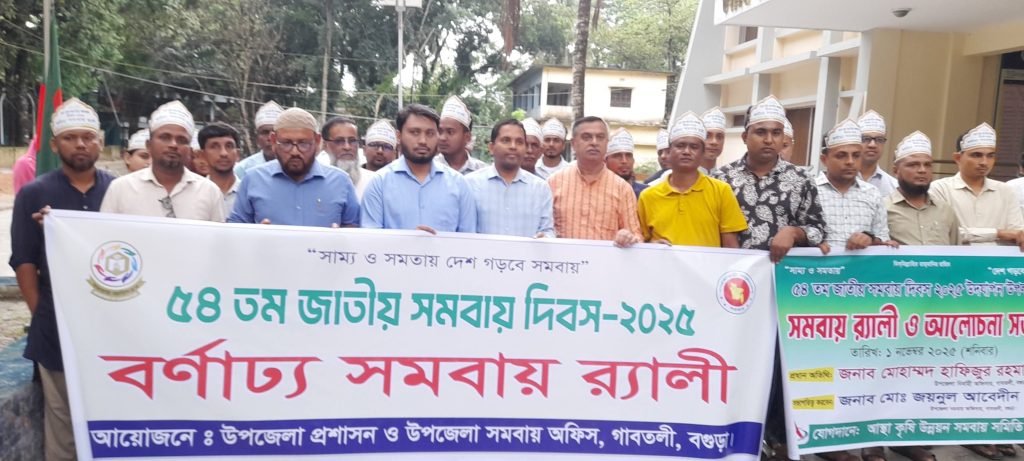 বগুড়া সংবাদ : ৫৩তম জাতীয় সমবায় দিবস উদযাপন উপলক্ষ্যে গতকাল শনিবার বগুড়ার গাবতলী উপজেলা সমবায় দপ্তরের আয়োজনে বর্ণাঢ্য র্যালী শেষে উপজেলা পরিষদ ইছামতি হলরুমে এক আলোচনা সভা অনুষ্ঠিত হয়। সভায় প্রধান অতিথির বক্তব্য রাখেন ইউএনও মোহাম্মদ হাফিজুর রহমান। উপজেলা সমবায় কর্মকর্তা জয়নুল আবেদীনের সভাপতিত্বে বিশেষ অতিথির বক্তব্য রাখেন উপজেলা সহকারী কমিশনার (ভূমি) এম আব্দুল্লাহ ইবনে মাসুদ আহমেদ, উপজেলা প্রকৌশলী সাজেদুর রহমান, নির্বাচন কর্মকর্তা আনিছুর রহমান। এছাড়াও বক্তব্য রাখেন সমবায়ী তরিকুল ইসলাম সোহাগ, মহিদুল ইসলাম, হামিদুল হক শিলু, জাহাঙ্গীর আলম, সাহিন সুলতানা সীমা প্রমুখ। সভা শেষে প্রধান অতিথি বিভিন্ন সমবায়ী ও সমিতির প্রধানদের মাঝে পুরস্কার বিতরণ করেন।