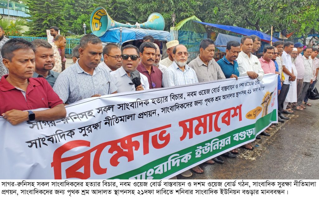 বগুড়া সংবাদ : সাংবাদিক ইউনিয়ন বগুড়া মানববন্ধনে নেতৃবৃন্দ বলেছেন, সাগর-রুনি হত্যাকাণ্ড নিয়ে বিগত সরকারের সময়ে তদন্তের নামে বারবার ধামাচাপা দেওয়া হয়েছে। বতর্মান সরকারের কাছে সাগর-রুমির হত্যার বিচার দাবি করি না। কারন এই সরকার তার পুলিশ বাহিনীর নিরাপত্তা দিতে পারে না। ১২মাসে ১৩বার হামলা হয় পলিশের উপরে। বতার্মান সরকারের কাছে দাবি আপনারা আসামিদের সনক্ত করে দেন সাংবাদিক সাগর-রুনিকে কারা হত্যা করেছে। দ্রুত চার্জশিট দেন পরবর্তী নির্বাচিত সরকারের সময় দেখা যাবে হত্যাকারীদের বিচার হবে কিনা। আন্তর্বর্তীকালীন সরকারের সময়েও সাংবাদিকদের হত্যা করা হয়েছে, নির্যাতিত করেছে। ১নভেম্বর শনিবার বেলা সাড়ে ১১টায় সাগর-রুনিসহ সকল সাংবাদিকদের হত্যার বিচার, নবম ওয়েজ বোর্ড বাস্তবায়ন ও দশম ওয়েজ বোর্ড গঠন, সাংবাদিক সুরক্ষা নীতিমালা প্রণয়ন, সাংবাদিকদের জন্য পৃথক শ্রম আদালত স্থাপনসহ ২১দফা দাবিতে সাংবাদিক ইউনিয়ন বগুড়ার মানববন্ধনে নেতৃবৃন্দ উপরোক্ত কথা বলেন। সাংবাদিক ইউনিয়ন বগুড়া সভাপতি গণেশ দাসের সভাপতিক্তে ও সাংবাদ সম্পাদক আবু সাঈদের সঞ্চালনায় মানববন্ধনে আরো বক্তব্য দেন ফেডারেল সাংবাদিক ইউনিয়নের নির্বাহী সদস্য মীর্জা সেলিম রেজা, বগুড়া প্রেসক্লাবের সভাপতি রেজাউল হাসান রানু, সাধারণ সম্পাদক কালাম আজাদ, সিনিয়র সাংবাদিক ফজলে রাব্বি ডলার, রাহত আহমেদ রিটু, আব্দুস সাত্তার, আব্দুর রহিম, সাইফুল ইসলাম, মাহফুজ মন্ডল। মানববন্ধনে নেতৃবৃন্দ আরো বলেন, বর্তমান সরকার নবম ওয়েজ বোর্ড বাস্তবায়নে সিনিয়র নেতৃবৃন্দের সাথে বৈঠকে অঙ্গীকার করেছেন। দ্রুত সময়ে দশম ওয়েজ বোর্ড ঘোষনা করুন। সাংবাদিক ইউনিয়নের নেতৃবৃন্দ ঢাকাতে চাকরিচ্যুত করার পরিকল্পনা করছে। জাতীয়তাবাদী মতাদর্শের কোন সাংবাদিককে চাকরিচ্যুত করা হলে রাজপথে কঠোর আন্দোলন গড়ে তোলা হবে।