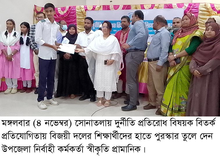 বগুড়া সংবাদ : বগুড়া জেলা দুর্নীতি দমক কমিশনের আয়োজনে মঙ্গলবার (৪ নভেম্বর) বিকেলে সোনাতলা উপজেলা পরিষদ মিলনায়তনে দুর্নীতি প্রতিরোধ বিষয়ক বিতর্ক প্রতিযোগিতা অনুষ্ঠিত হয়েছে। সোনাতলা সরকারি মডেল উচ্চ বিদ্যালয় ও বয়ড়া কারিগরি উচ্চ বিদ্যালয়ের শিক্ষার্থীরা প্রতিযোগিতায় অংশ গ্রহণ করে। বিচারকমন্ডলীরা সোনাতলা সরকারি মডেল উচ্চ বিদ্যালয়কে বিজয়ী বলে ঘোষণা করেন এবং পুরস্কার হিসেবে ক্রেস্ট,সনদ ও মেডেল প্রদান করেন। এসব প্রদানের আগে বক্তব্য দেন উপজেলা নির্বাহী কর্মকর্তা স্বীকৃতি প্রামানিক,দুর্নীতি দমন কমিশন বগুড়ার উপ-সহকারী পরিচালক মোঃ রোকনুজ্জামান,সোনাতলা উপজেলা কৃষি কর্মকর্তা কৃষিবিদ মোঃ সোহরাব হোসেন,উপজেলা মাধ্যমিক শিক্ষা কর্মকর্তা শেখ নজমুল ইসলাম,মহিলা বিষয়ক কর্মকর্তা মাঈনুল হক,প্রাণিসম্পদ কর্মকর্তা নুসরাত জাহান লাকী,মৎস্য সম্প্রসারণ কর্মকর্তা রোকসানা খাতুন,উপজেলা একাডেমিক সুপারভাইজার সেতারা রওশন জাহান,বয়ড়া কারিগরি স্কুল এন্ড কলেজের অধ্যক্ষ মোঃ আব্দুল ওয়াহেদ, হরিখালী উচ্চ বিদ্যালয়ের প্রধান শিক্ষক আব্দুল্লাহ-আল-মাসুদ,সবুজ সাথী উচ্চ বিদ্যালয়ের প্রধান শিক্ষক মহসীনা খাতুন ও ভিকনেরপাড়া উচ্চ বিদ্যালয়ের প্রধান শিক্ষক ইন্তেজার রহমান বেপারী-সহ অন্যান্য বিদ্যালয়ের শিক্ষক ও শিক্ষার্থরা।