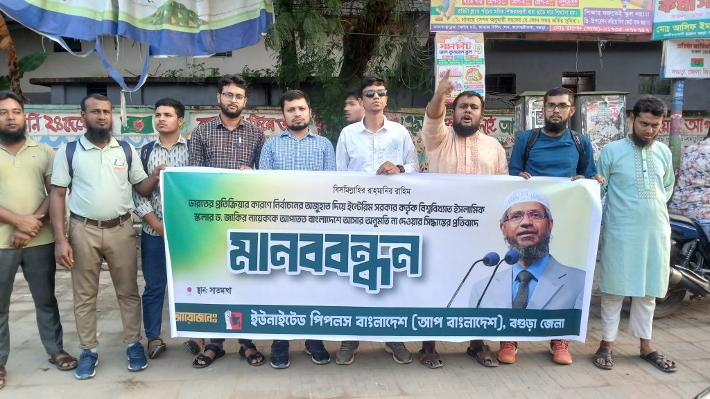 বগুড়ায় ড. জাকির নায়েককে বাংলাদেশে আসার অনুমতি না দেওয়ার প্রতিবাদে আপ বাংলাদেশের মানববন্ধন
