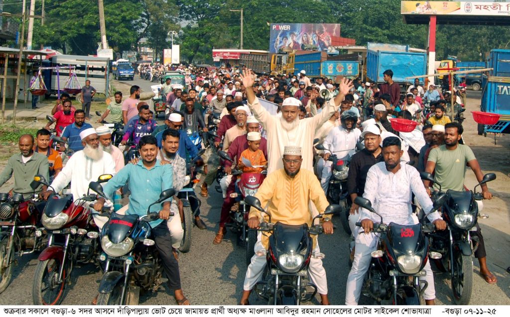 বগুড়া সংবাদ : আসন্ন ত্রয়োদশ জাতীয় সংসদ নির্বাচনকে ঘিরে জামায়াত প্রার্থী ভোটের মাঠে উত্তাপ ছড়াচ্ছেন। বগুড়া-৬ সদর আসনে জামায়াত মনোনীত সংসদ সদস্য প্রার্থী অধ্যক্ষ মাওলানা আবিদুর রহমান সোহেল নেতৃত্বে শুক্রবার সকালে সদরের রাজাপুর ইউনিয়নের বাংলাহাট এলাকা থেকে বিশাল মোটরসাইকেল শোভাযাত্রা বের হয়। শোভাযাত্রাটি ২য় বাইপাস সড়ক হয়ে সাবগ্রাম ইউনিয়নের প্রধান সড়ক প্রদক্ষিণ শেষে শাখারিয়া ইউনিয়নে গিয়ে শেষ হয়। হাজারো মোটরসাইকেল শোভাযাত্রায় উৎসবমুখর পরিবেশে সড়কের দু’পাশে পথচারী ও স্থানীয় জনতা হাত নেড়ে অংশগ্রহণকারীদের অভিনন্দন জানান।