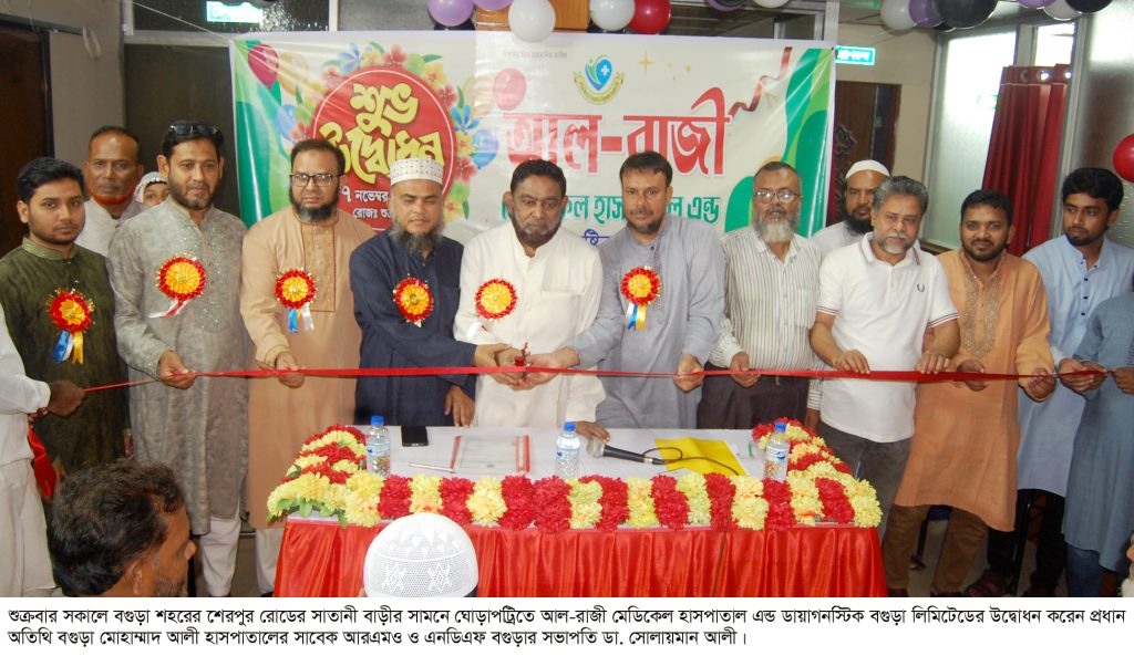 বগুড়া সংবাদ : শুক্রবার সকালে বগুড়া শহরের শেরপুর রোডের সাতানী বাড়ীর সামনে ঘোড়াপট্রিতে আল-রাজী মেডিকেল হাসপাতাল এন্ড ডায়াগনস্টিক বগুড়া লিমিটেডের উদ্বোধনী অনুষ্ঠান হাসপাতালের চেয়ারম্যান ফয়জুল হাসান মিলনের সভাপতিত্বে অনুষ্ঠিত হয়। অনুষ্ঠানে প্রধান অতিথি ছিলেন বগুড়া মোহাম্মাদ আলী হাসপাতালের সাবেক আরএমও ও এনডিএফ বগুড়ার সভাপতি ডা. সোলায়মান আলী। বিশেষ অতিথি ছিলেন এনডিএফ বগুড়ার সভাপতি ডা. রিয়াকত আলী, এনডিএফ বগুড়ার সেক্রেটারী ডা. মাহবুবুর রহমান, আই বি ডাব্লিউ এফ বগুড়ার সভাপতি মাহফুজুল হক, এনসিপি বগুড়ার সমন্বয়ক আব্দুল্লাহিত তাকি, বগুড়া শহর জামায়াতের সহকারী সেক্রেটারী অ্যাডভোকেট আল আমিন । আরো বক্তব্য রাখেন হাসপাতালের ভাইস চেয়ারম্যান আসলাম হোসেন বিপু, ব্যবস্থাপনা পরিচালক জামিল মাহমুদ, পরিচালক নোমান আকন্দ, পরিচালক আব্দুল্লাহ আল মাহমুদ, বগুড়া শহর ম্রমিক কল্যাণ ফেডারেশনের সভাপতি আজগর আলী, মাহবুবুর রহমান মুকুল, ইয়াকুবিয়া স্কুল এন্ড কলেজের অভিভাবক কমিটির সভাপতি মোশাররফ হোসেন, আব্দুর রউফ, পরিচালক নাছিমা আকতার, ডা. তৌফাতুন নেছা শ্রাবণী, মাসুম হোসেন প্রমুখ। অনুষ্ঠান শেষে প্রতিষ্ঠানের কল্যাণ কামনায় দোয়া অনুষ্ঠিত হয়।