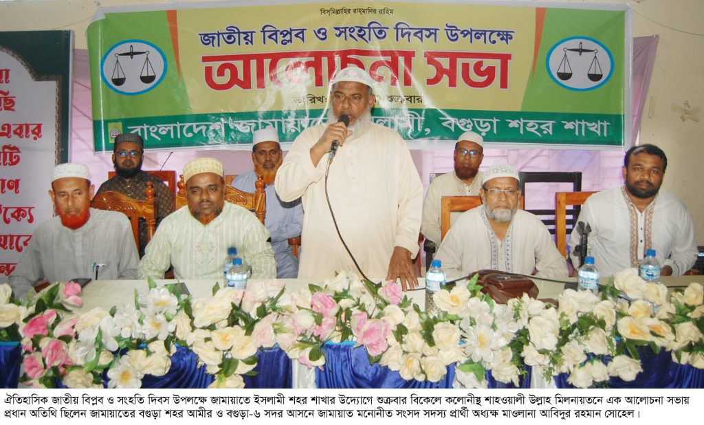 বগুড়া সংবাদ : ঐতিহাসিক জাতীয় বিপ্লব ও সংহতি দিবস উপলক্ষে বাংলাদেশ জামায়াতে ইসলামী বগুড়া শহর শাখার উদ্যোগে শুক্রবার বিকেলে কলোনীস্থ শাহওয়ালী উল্লাহ মিলনায়তনে এক আলোচনা সভা অধ্যাপক রফিকুল আলমের সভাপতিত্বে অনুষ্ঠিত হয়। সভায় প্রধান অতিথি ছিলেন জামায়াতের বগুড়া শহর আমীর ও বগুড়া-৬ সদর আসনে জামায়াত মনোনীত সংসদ সদস্য প্রার্থী অধ্যক্ষ মাওলানা আবিদুর রহমান সোহেল। বিশেষ অতিথি ছিলেন শহর জামায়াতের নায়েবে আমীর মাওলানা আলমগীর হুসাইন, সেক্রেটারী অধ্যাপক আ স ম আব্দুল মালেক, অধ্যাপক আব্দুস সালাম তুহিন, আব্দুল হাদি শফিক।