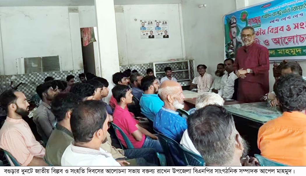 বগুড়া সংবাদ : বগুড়ার ধুনট উপজেলা বিএনপির সাংগঠনিক সম্পাদক আপেল মাহমুদের উদ্যোগে জাতীয় বিল্পব ও সংহতি দিবস পালিত হয়েছে। শুক্রবার দুপুর ১২টায় ধুনট হুকুমআলী বাসষ্ট্যান্ড এলাকায় বিএনপি ও সহযোগি সংগঠনের একাংশের নেতাকর্মীদের আয়োজিত এক আলোচনা সভায় প্রধান অতিথির বক্তব্য রাখেন বিএনপি নেতা আপেল মাহমুদ।