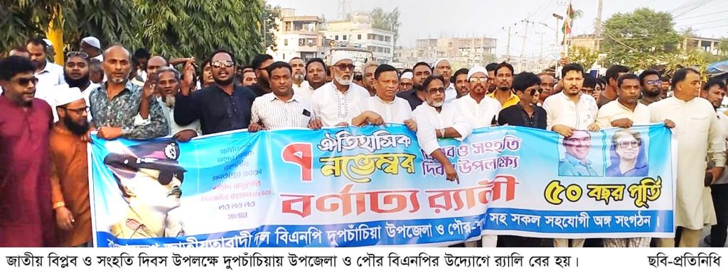 বগুড়া সংবাদ : দুপচাঁচিয়া উপজেলা ও পৌর বিএনপি ও অঙ্গ সংগঠনের আয়োজনে জাতীয় বিপ্লব ও সংহতি দিবস পালিত হয়েছে। এ উপলক্ষে ৭নভেম্বর শুক্রবার সকালে অস্থায়ী দলীয় কার্যালয়ে জাতীয় ও দলীয় পতাকা উত্তোলন, শহীদ জিয়াউর রহমান এর প্রতিকৃতিতে পুষ্পমাল্য অর্পণ করা হয়। বিকেলে ঊষা প্লাজার সামনে থেকে একটি র্যালি বের হয়ে উপজেলা সদরের বিভিন্ন রাস্তা প্রদক্ষিন করে। র্যালি শেষে ঊষা প্লাজা চত্বরে উপজেলা বিএনপির সভাপতি একেএম মনিরুল ইসলাম খান স্বপনের সভাপতিত্বে ও পৌর বিএনপির সাধারণ সম্পাদক আখতারুজ্জামান তুহিন এর পরিচালনায় আলোচনা সভায় বক্তব্য রাখেন বগুড়া জেলা বিএনপির সহসভাপতি ও শহর বিএনপির সভাপতি এ্যাড. হামিদুল হক চৌধুরী হিরু। এসময় উপস্থিত ছিলেন জেলা বিএনপির প্রবাসী কল্যান বিষয়ক সম্পাদক আব্দুল মান্নান, উপজেলা বিএনপির সাধারণ সম্পাদক আব্দুর রহিম, সাবেক সাধারণ সম্পাদক ও সাবেক পৌর মেয়র জাহাঙ্গীর আলম, সাংগঠনিক সম্পাদক মেশকাতুর রহমান, পৌর বিএনপির ভারপ্রাপ্ত সভাপতি এ্যাড. সাইফুর রহমান, সাংগঠনিক সম্পাদক জাহিদুল হক তালুকদার কাজল, ইউনুছ আলী মহলদার মানিক, যুবদল নেতা আশরাফুল আলম, উপজেলা যুবদলের যুগ্ম আহবায়ক আব্দুস সবুর খন্দকার রাকিব, পৌর যুবদলের সিনিয়র যুগ্ম আহবায়ক নাঈম কবিরাজ, যুবদল নেতা মোবাদুন নবী তিতাস, রাবু খান, ইদ্রিস আলী খান, ওবাইদুর রহমান, উপজেলা স্বেচ্ছাসেবকদলের আহবায়ক আব্দুর রাজ্জাক, সদস্য সচিব আব্দুল মান্নান, মহিলাদল নেত্রী আসফিয়া হায়াত সিলভা, নাছরিন আক্তার, পলি আক্তার, উপজেলা জাসাসের সভাপতি নূর মোহাম্মাদ তালুকদার রুবেল, উপজেলা শ্রমিকদলের সাধারণ সম্পাদক আব্দুল মতিন, পৌর মৎস্যজীবী দলের সাধারণ সম্পাদক শহীদুল আলম, উপজেলা ছাত্রদলের সাধারণ সম্পাদক ফজলে রাব্বি, পৌর ছাত্রদলের সভাপতি নাঈম সরদার সহ বিএনপি, যুবদল, ছাত্রদল ও অঙ্গ সহযোগী সংগঠনের নেতাকর্মী। শেষে শহীদ রাষ্ট্রপতি জিয়াউর রহমান এর রুহের মাগফেরাত ও বিএনপির চেয়ারপার্সন সাবেক প্রধানমন্ত্রী বেগম খালেদা জিয়ার সুস্থ্যতা কামনায় দোয়া করা হয়।