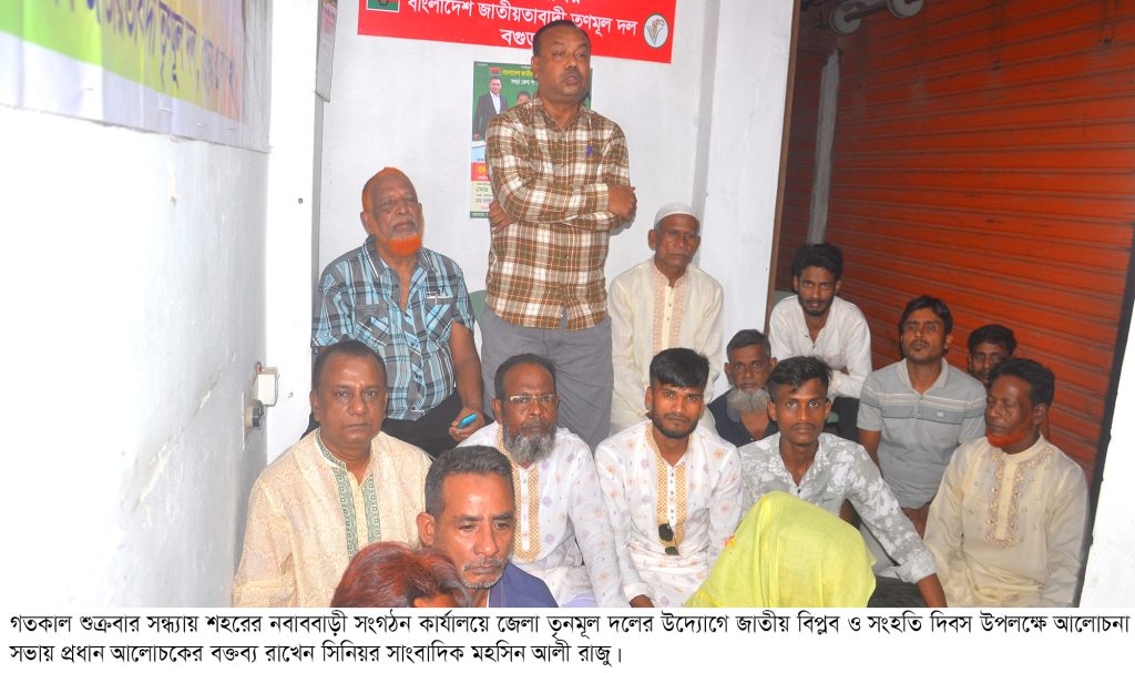 জাতীয়তাবাদী তৃনমূল দল কেন্দ্রীয় কমিটির সহ-সভাপতি ও বগুড়া জেলার সভাপতি মোঃ আব্দুল বারী এর সভাপতিত্বে এতে প্রধান আলোচকের বক্তব্য রাখেন সিনিয়র সাংবাদিক মহসিন আলী রাজু। দ্বিতীয় আলোচকের বক্তব্য রাখেন সংগঠনের জেলার উপদেষ্টা লাল মিয়া। এসময় আরো বক্তব্য রাখেন তৃণমূল দল জেলা শাখার সাধারণ সম্পাদক মাসুদুর রহমান মাসুদ, সিনিয়র সহ-সভাপতি মোঃ বাদশা প্রমানিক, সহ-সভাপতি জহির আহম্মেদ, যুগ্ম সাধারণ সম্পাদক মোঃ আজম, শহর কমিটির সভাপতি আব্দুস সোবহান শেখ, তৃণমূল দল নেতা রতন চৌধুরী, কামরুল ইসলাম, তারাজুল ইসলাম, মোঃ তাজ উদ্দিন, মুঞ্জু, দুলাল, আলামিন, আরিফ, নাদিম, মিলন, মামুন, বিজয়, গণি, জাহিদসহ প্রমুখ।
