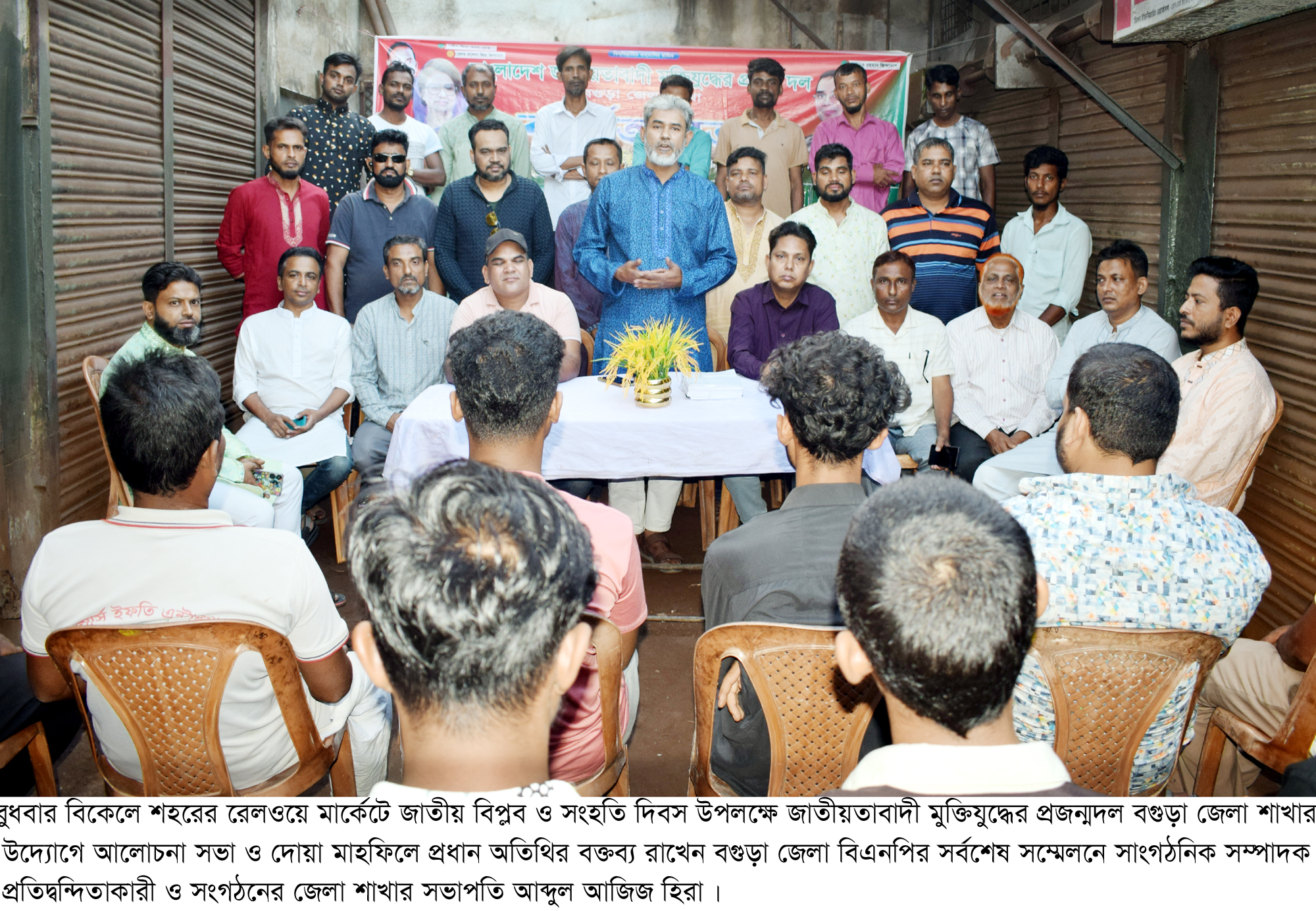 বগুড়া সংবাদ : জাতীয় বিপ্লব ও সংহতি দিবস উপলক্ষে বাংলাদেশ জাতীয়তাবাদী মুক্তিযুদ্ধের প্রজন্ম দল বগুড়া জেলা শাখার উদ্যোগে আলোচনা সভা ও দোয়া মাহফিল অনুষ্ঠিত হয়েছে। গতকাল শুক্রবার বিকেলে বগুড়া রেলওয়ে মার্কেটে এ সভার আয়োজন করা হয়। এতে প্রধান অতিথি হিসেবে উপস্থিত ছিলেন সংগঠনের জেলা শাখার সভাপতি ও বগুড়া জেলা বিএনপি’র সর্বশেষ সম্মেলনে সাংগঠনিক পদে প্রতিদ্ব›িদ্বতাকারি আব্দুল আজিজ হীরা। এসময় তিনি বলেন শহীদ প্রেসিডেন্ট জিয়াউর রহমানকে এদিন বাংলাদেশের সিপাহী জনতা তাকে কারাগার থেকে মুক্ত করেছিলেন, তিনি ছিলেন বিশ্ব নন্দিত নেতা। বিশ্বের দরবারে তিনি বাংলাদেশকে পরিচয় ঘটিয়েছেন। সদর উপজেলার সদস্য সচিব রেজাউল সরকার রেজার পরিচালনায় এতে আরো উপস্থিত ছিলেন জেলার সহ সভাপতি মোঃ আবুল কাসেম, সাধারণ সম্পাদক মোঃ আব্দুল্লাহ আলহেল কাফী নিপন,সাংগঠনিক সম্পাদক মোঃ মিজানুর রহমান মিজান, সহ, সাংগঠনিক সম্পাদক মোঃ খাইরুল হাসান কোমল,সহ সাংগঠনিক সম্পাদক শায়েস্তা খান, জেলার যুগ্ম সাধারণ সম্পাদক মো:রফিকুল ইসলাম রফিক, জেলার শিক্ষা বিষয়ক সম্পাদক শ্রী গৌরাঙ্গ মোহন বসাক, জেলার ক্রিয়া বিষয়ক সম্পাদক এবং বগুড়া সদর উপজেলা শাখার আহবায়ক মোঃরাসেল শেখ, শহর শাখার আহবায়ক জনি শেখ শহর শাখার সদস্য সচিব মো আবদুল হাকিম, শহর শাখার যুগ্ন আহবায়ক মোঃ জামাল উদ্দিন,রানা। আরও উপস্হিত ছিলেন ,নয়ন,রাসেল রহমান,রাশেদ,মোরশেদ,২নং সাবগ্রাম ইউনিয়ন ও বগুড়া সদর উপজেলা শাখার যুগ্ন আহবায়ক আহাদ আলী খোকন, সদর এর যুগ্ন আহবায়ক এ আর চৌধুরী রাখু প্রমুখ।