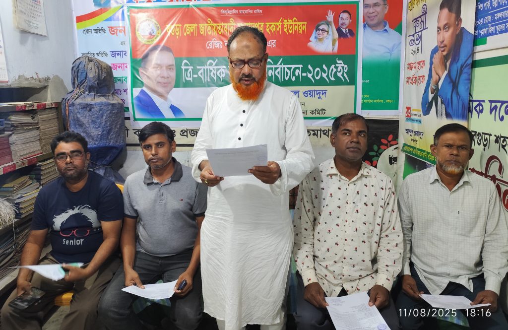 তফসিল ঘোষণা করেন নির্বাচন পরিচালনা কমিটির চেয়ারম্যান ও শ্রমিক দল বগুড়া জেলা শাখার সভাপতি আব্দুল ওয়াদুদ। এ সময় উপস্থিত ছিলেন নির্বাচন পরিচালনা কমিটির সদস্য সচিব লিটন শেখ বাঘা, সদস্য সাদেক আলী, সদস্য বি. এম. বকুল ও সদস্য শফিকুল ইসলাম।